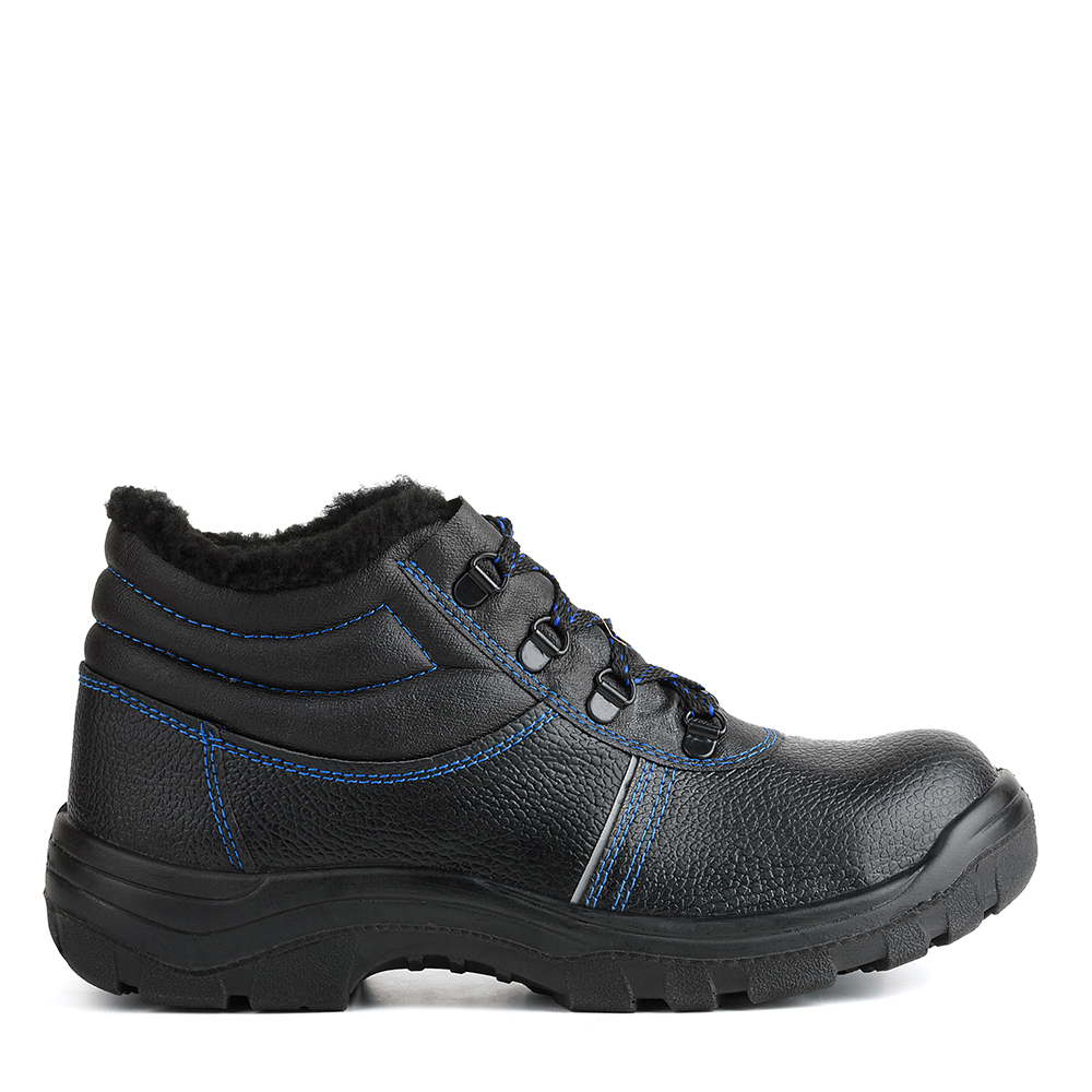 Ботинки изготовлены методом прямого литья подошвы к заготовке верха обуви. Имеется пристроченная прилитая задинка. Верх ботинок изготовлен из натуральной кожи. Подкладка ботинок выполнена из искусственного меха. В верхней части ботинок выполнен мягкий кант. Ботинки завязываются на шнурки и имеют глухой клапан. Шнуровка производится с использованием металлических люверсов. На глухом клапане в середине имеется мягкая вставка из поролона для комфортного ношения. Стелька вкладная. В носочной части стопы выполнен внутренний защитный подносок из металла ударной прочностью 200 Дж. На правой и левой боковинах выполнены световозвращающие элементы в виде полосок для лучшей видимости работника. Выполнена контрастная отстрочка синего цвета в тон подкладки и цветной нити на шнурках. Подошва однослойная, полиуретановая, маслобензостойкая. Есть внутренняя амортизирующая вставка в пяточной части подошвы. Глубина профиля (протектора) ходового слоя подошвы составляет 3,5 мм. Цвет ботинок черный.