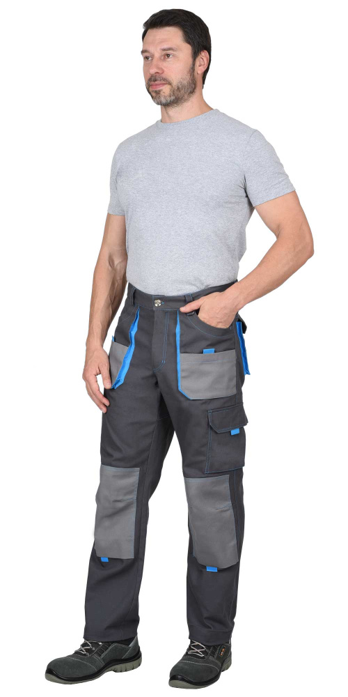 Изделие с притачным поясом, частично стянутым резинкой по бокам и различными многофункциональными карманами.