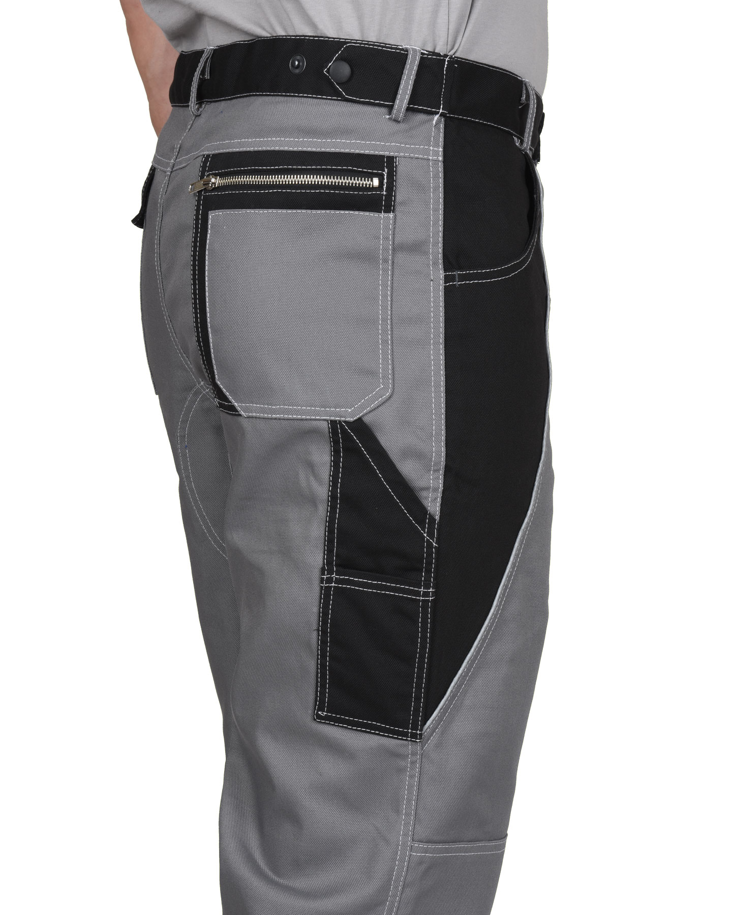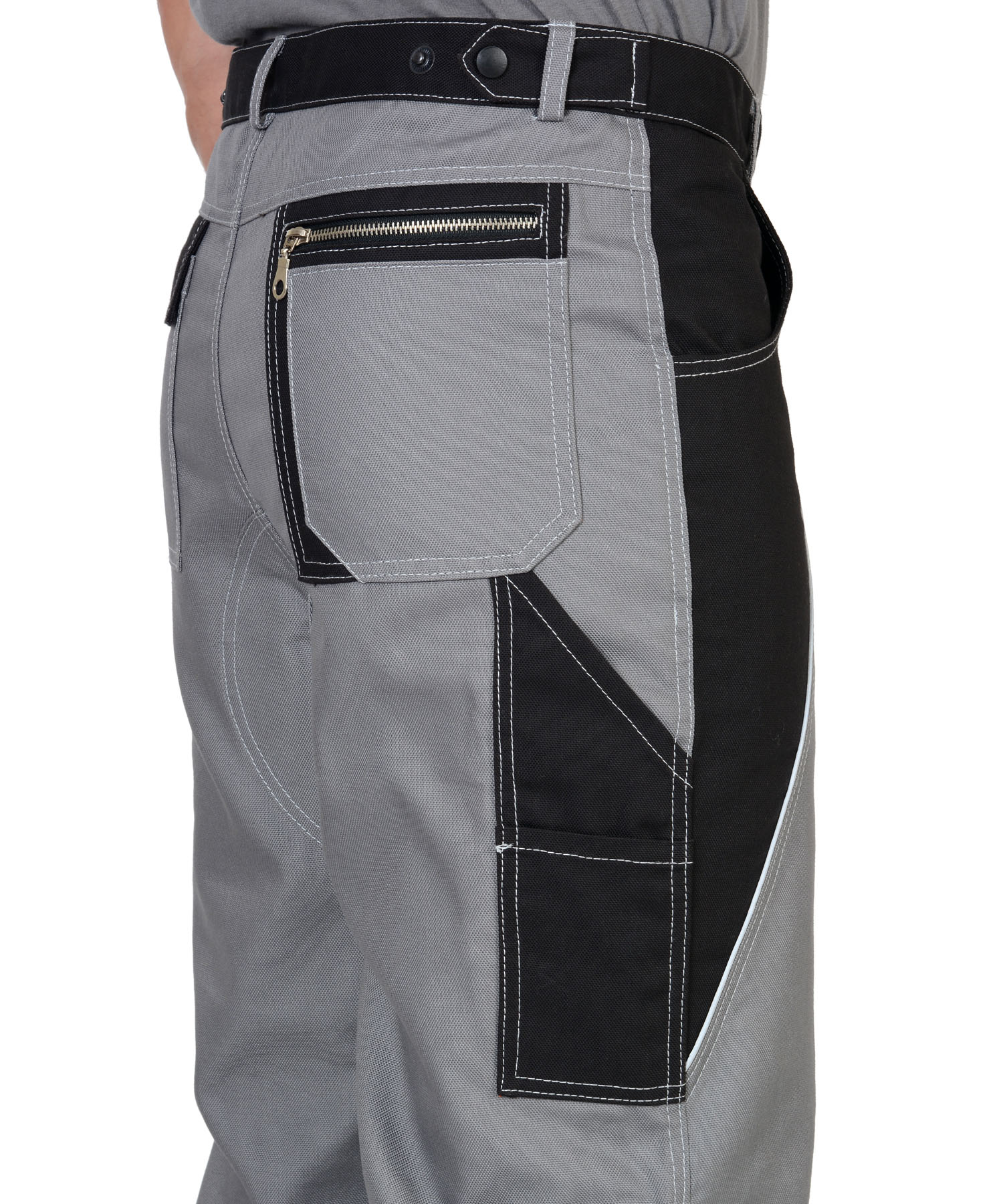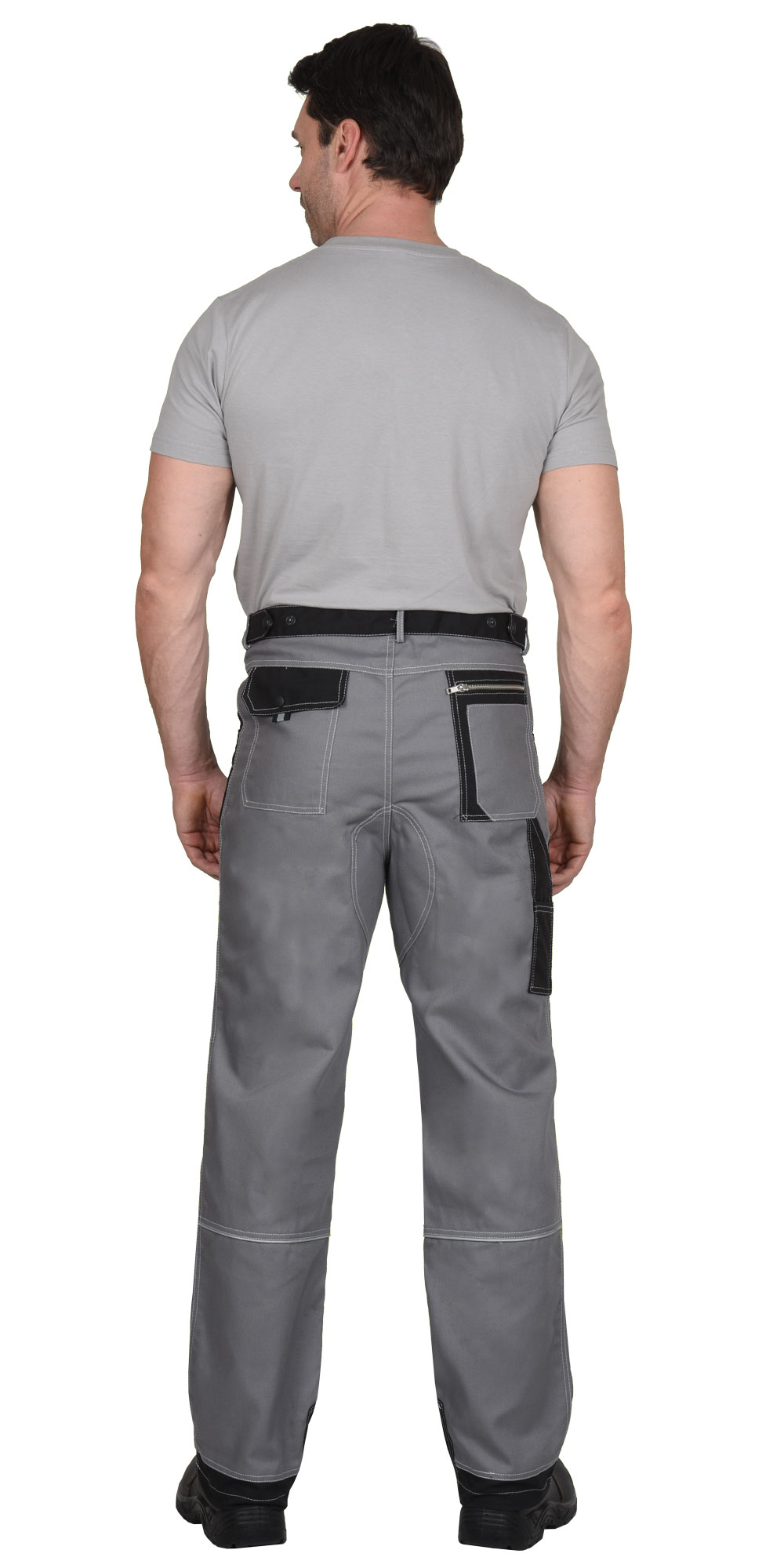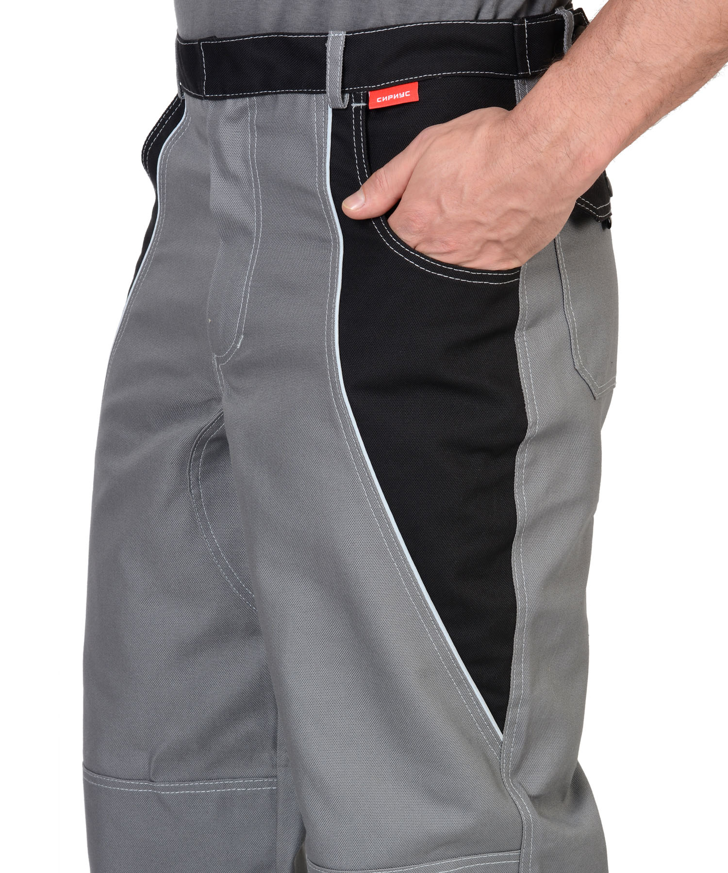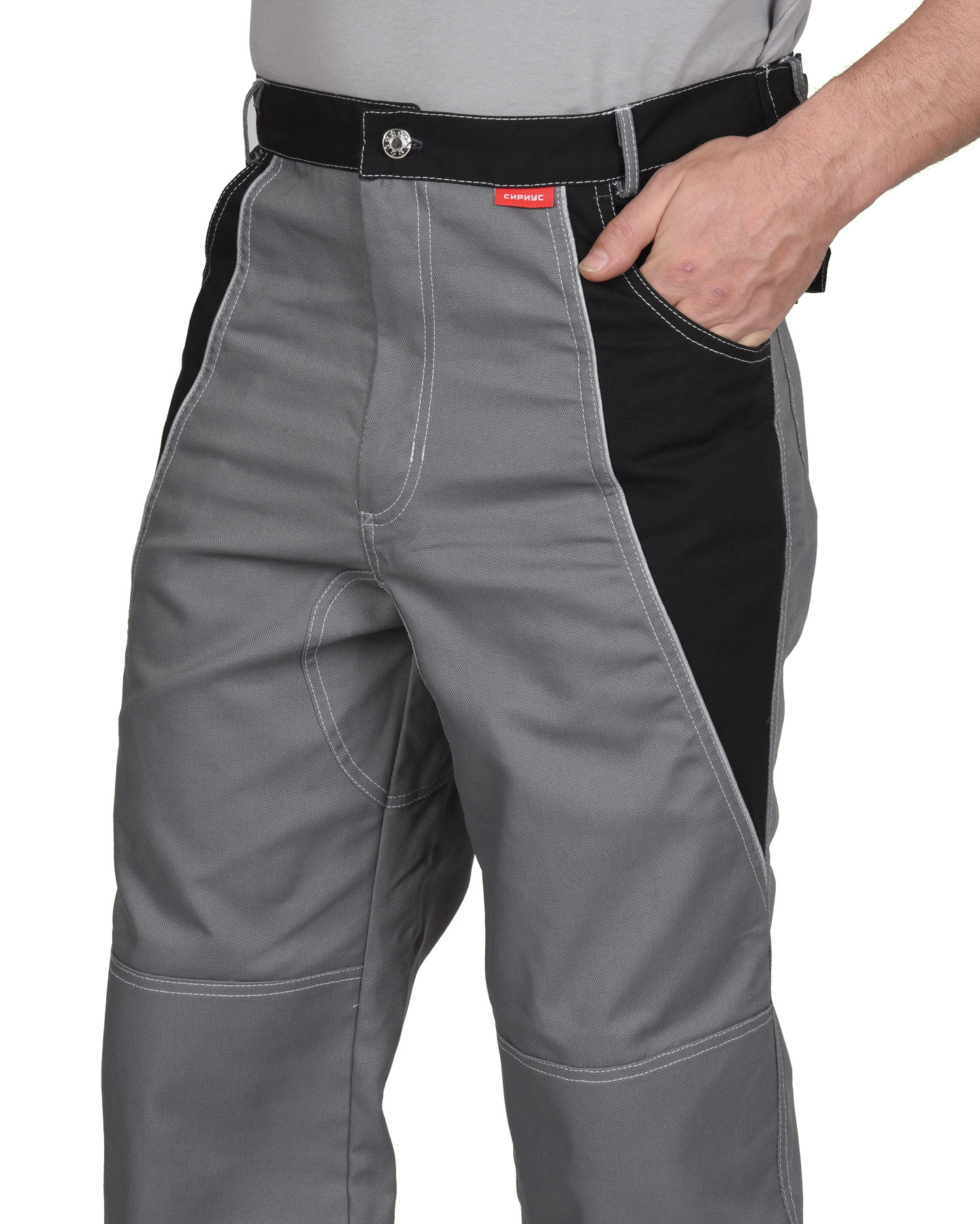 Брюки прямые, изготовлены из ткани "Панакота Комфорт", с застёжкой спереди на молнию, с притачным поясом на пуговице, с внутренними боковыми карманами и наколенниками, с усилительными накладками по шаговому шву и по низу брюк, с накладными задними карманами, с карманом для инструментов. На задних половинках предусмотрен СВ кант для сигнальной видимости.