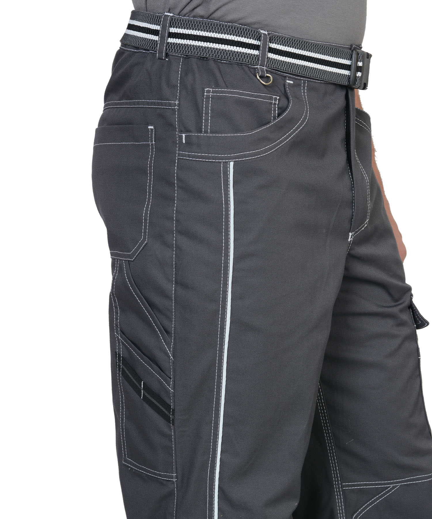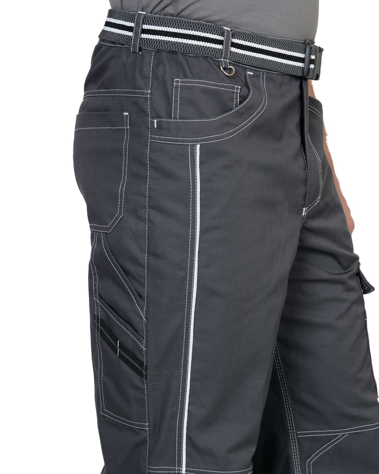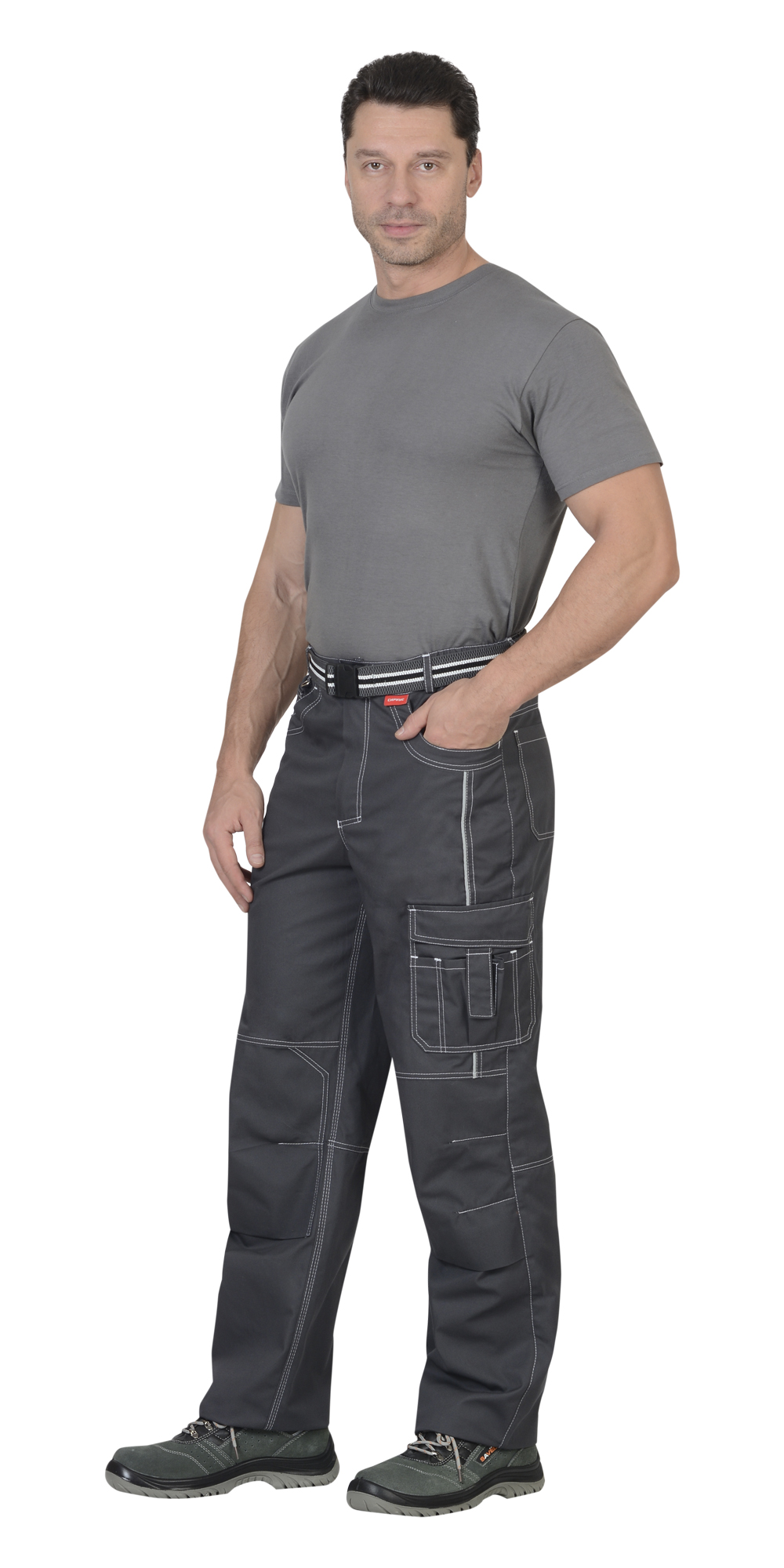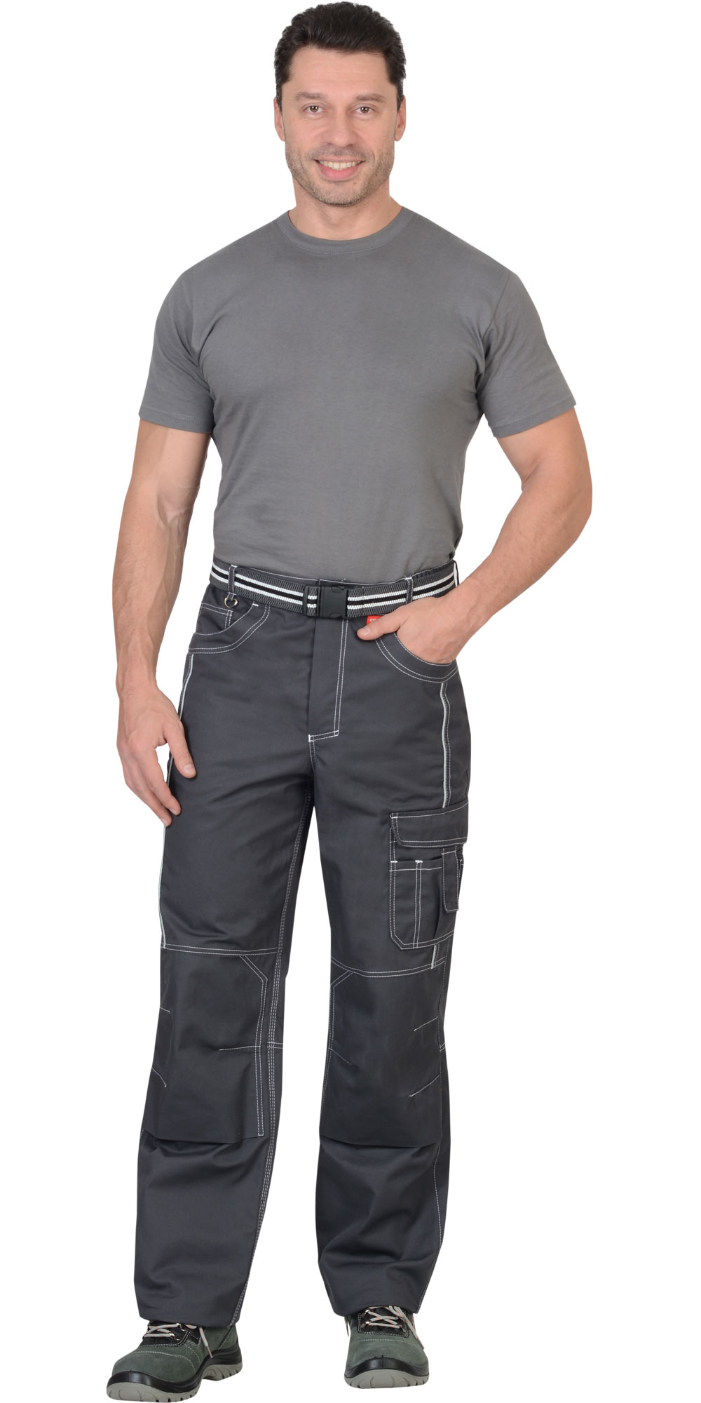 Брюки прямые, на притачном поясе, с застёжкой спереди на молния, с боковыми внутренними карманами, с часовым карманом; на задних половинках с отрезной кокеткой, двумя накладными карманами и карманами под инструменты. В брюках предусмотрен СВ кант для обозначения сигнальной видимости.