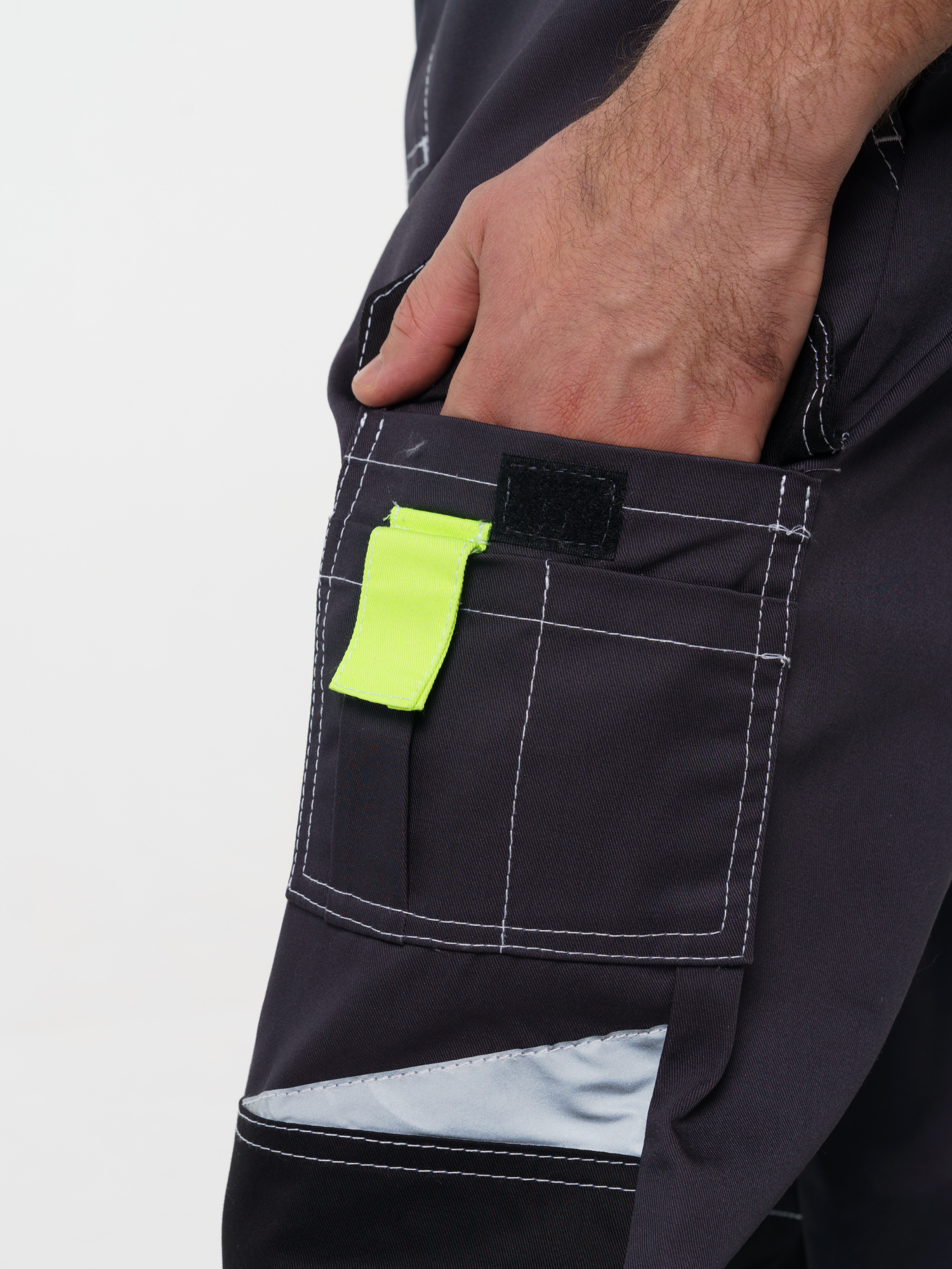 Брюки ФАВОРИТ-МЕГА прямые; с застёжкой гульфика на тесьму - «молния»; с застежкой пояса на одну петлю и пуговицу; с боковыми внутренними карманами; с карманами и фигурными клапанами застегивающиеся на потайную липучку на боковом шве; с фигурным карманом на задней половинке; с карманами под инструменты; с наколенниками. Пояс брюк частично стянут резинкой ткацкой по бокам. В брюках предусмотрена лента светоотражающая (мелкодисперсная белая) 50 мм фигурной формы. имеются лимонные отделочные элементы на карманах.