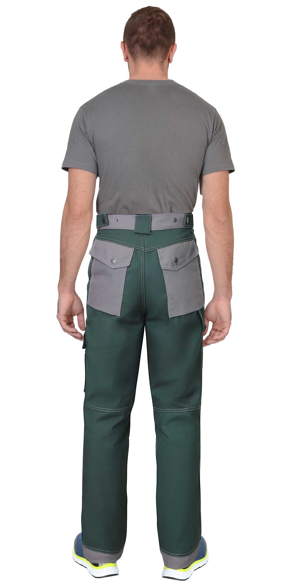 Брюки прямые, на поясе, с застёжкой спереди - гульфик с молнией, с накладными карманами спереди, сзади и на левом боковом шве, с объёмными наколенниками с нижним входом для амортизационного вкладыша. Объём брюк по талии регулируется при помощи хлястиков с кнопками на поясе.