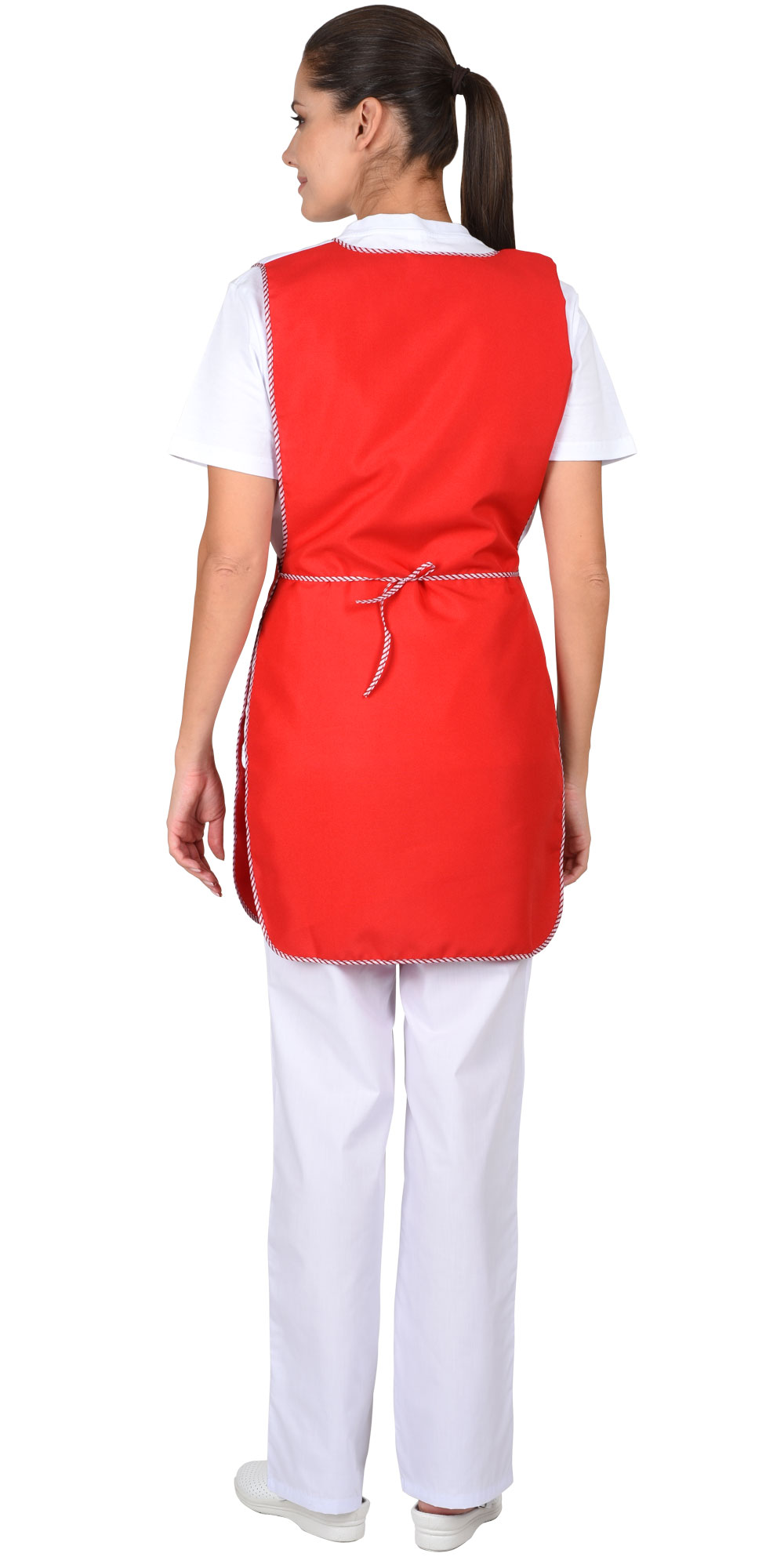 Фартук с круглым вырезом горловины, боковыми завязками для регулировки объема, с большим накладным карманом с зональным делением. Фартук по горловине, верхнему срезу кармана и края окантован окантовочной лентой из отделочной ткани. На фартуке в области кокетки выполнена аппликация.