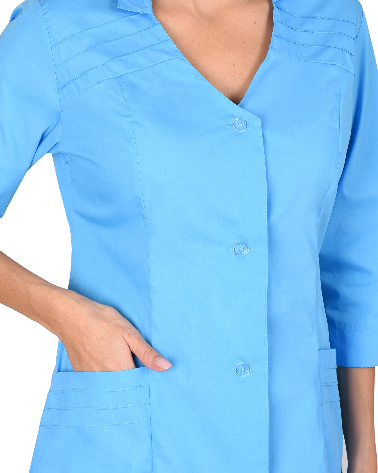 Укороченный халат полуприлегающего силуэта. Особенность модели-декоративные защипы по кокеткам и на карманах. Воротник-стойка. Рукава 3/4 с фигурным разрезом.
