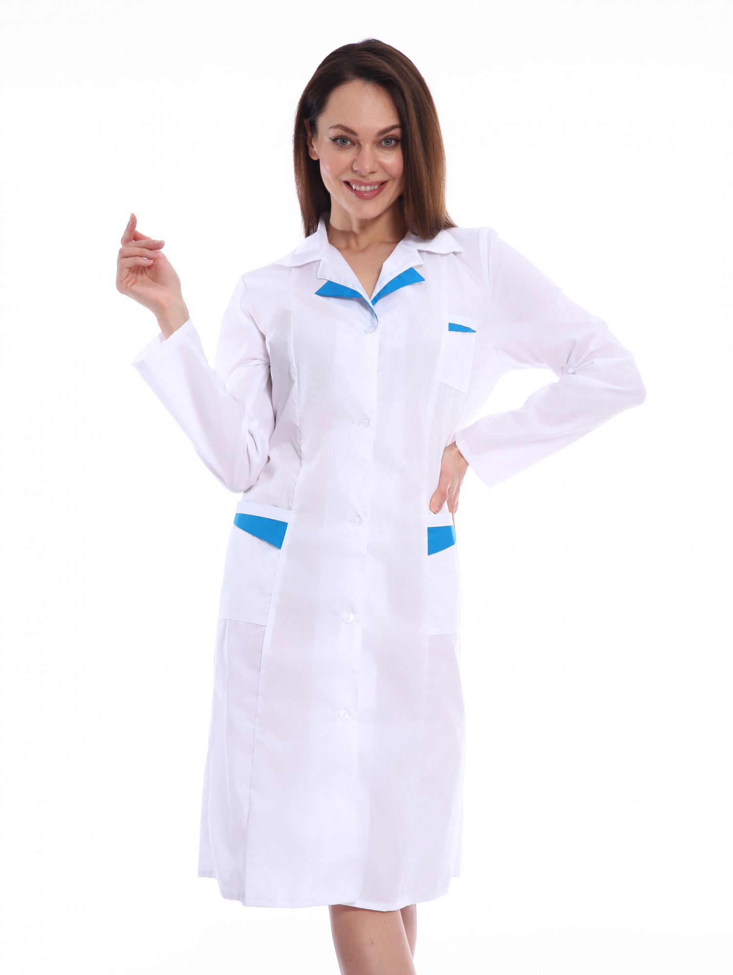 Халат женский с фигурной отделкой на лацканах и карманах, застежка на пуговицах, вертикальные рельефы. Ширина по линии талии регулируется хлястиком.