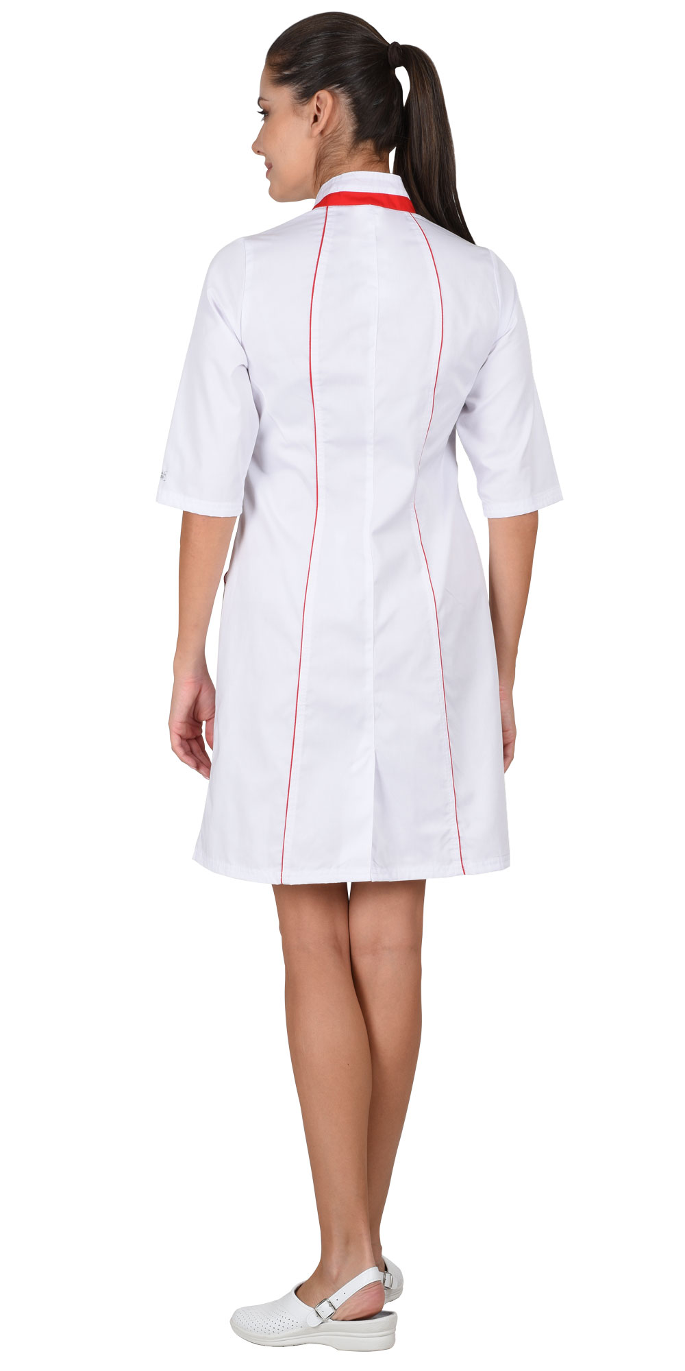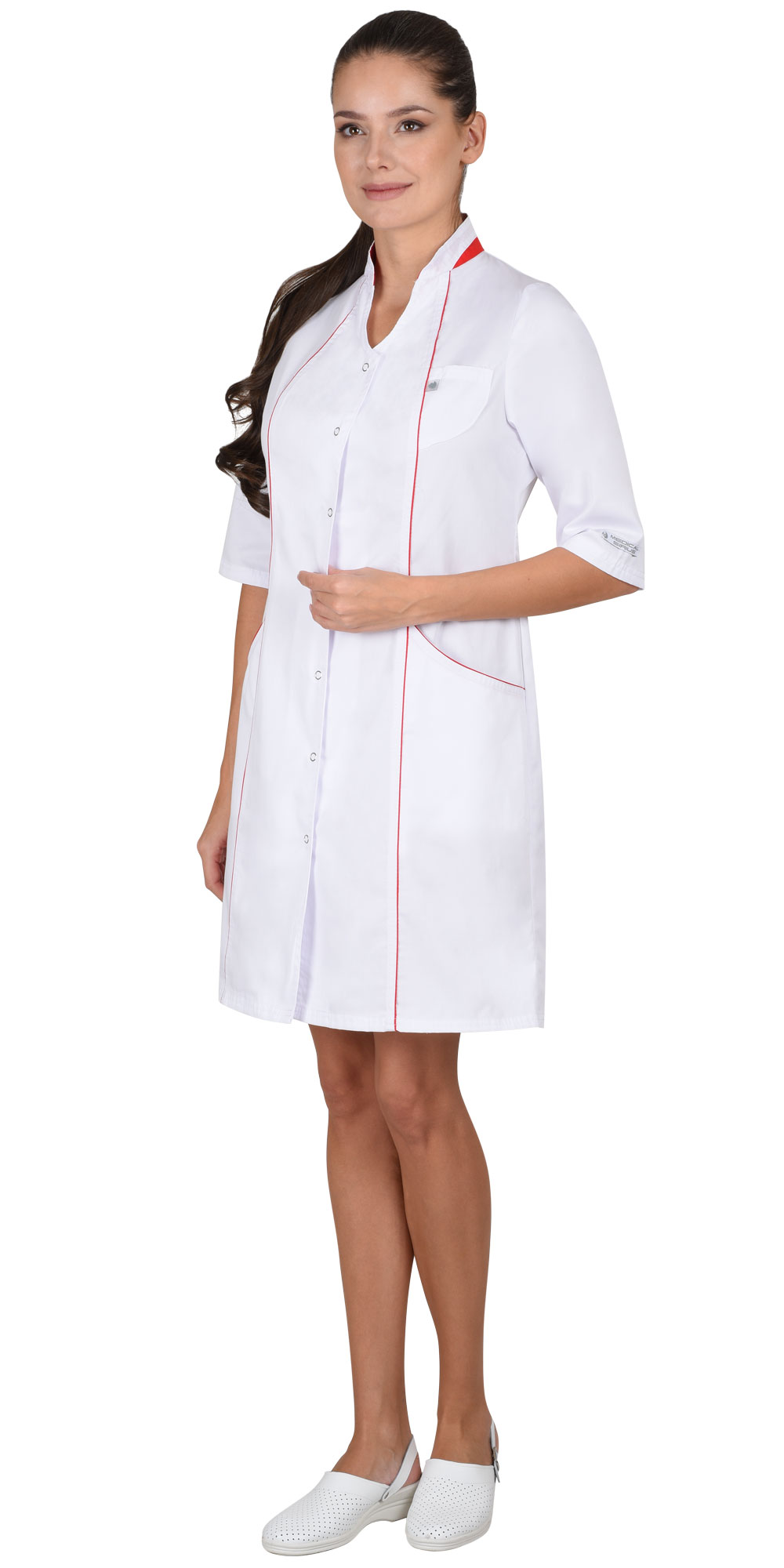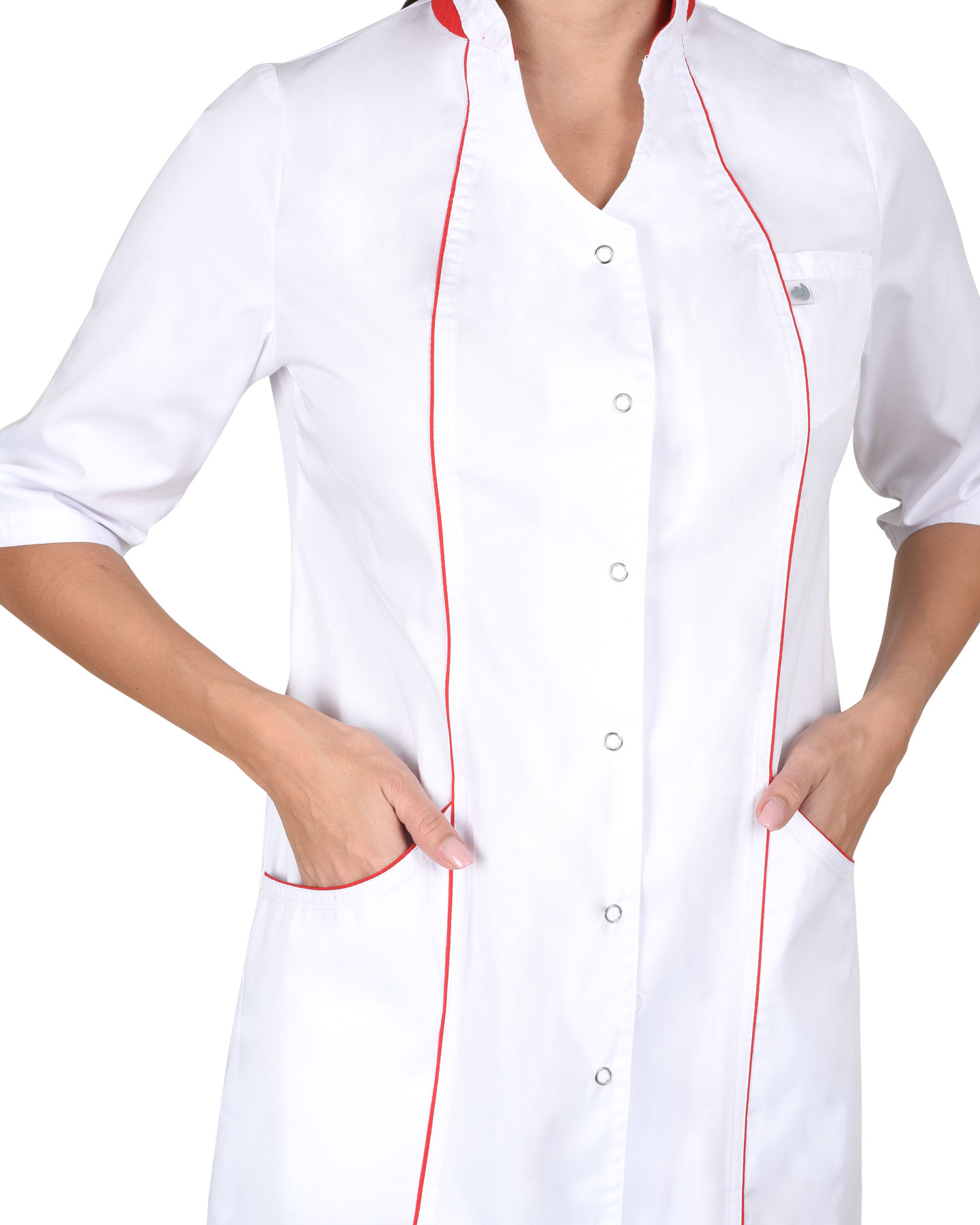Халат полуприлигающего силуэта, с центральной застежкой на кнопки с верхними и нижними фугурными карманами. Воротник-стойка, в рельефных швах халата отделочный кант. Рукава 3/4. Цвет отделки: Красный.