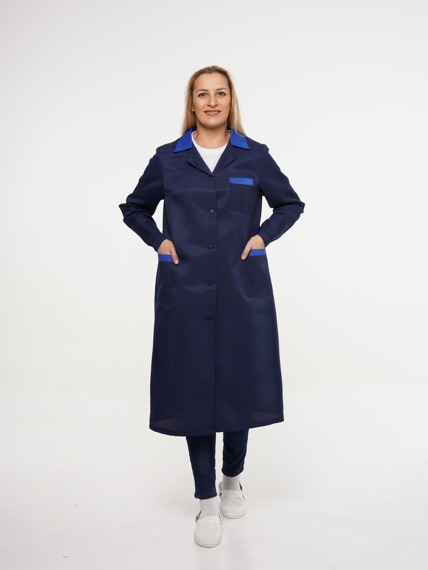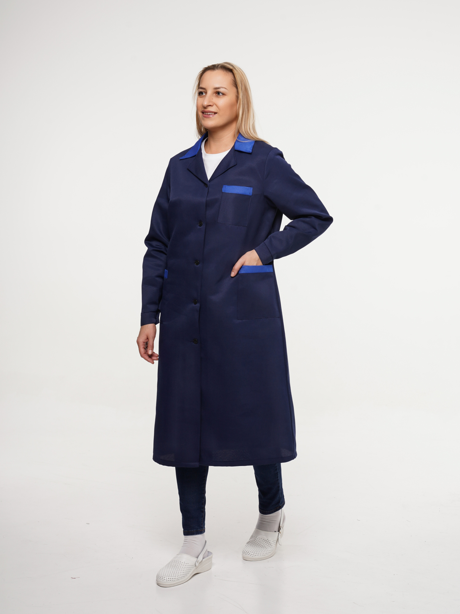 Халат рабочий женский №205 тёмно-синий с васильковым (ЧЗ) (112-116/182-188)