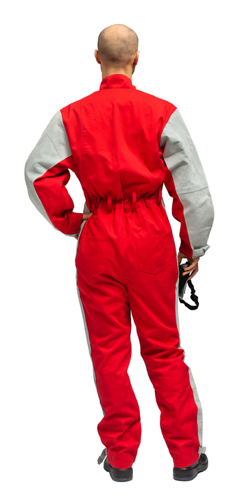 Комбинезон имеет усилители из спилка, конструкция обеспечивает защиту от проникновения пыли за счет закрытой застежки и регулируемых стяжек на рукавах и по низу брюк.
