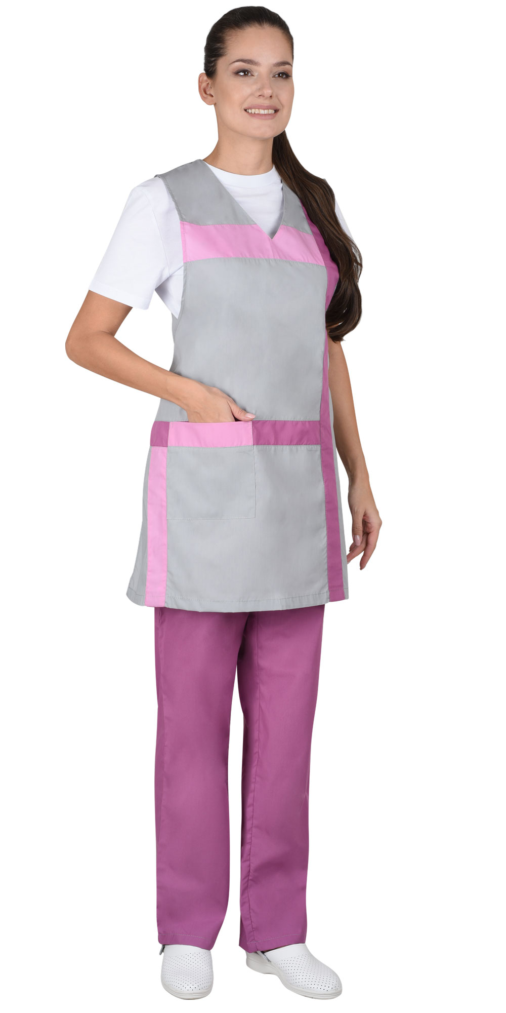 Комплект "ГАЛАТЕЯ" женский: фартук, брюки серый с розовым (ЧЗ) (120-124/158-164)