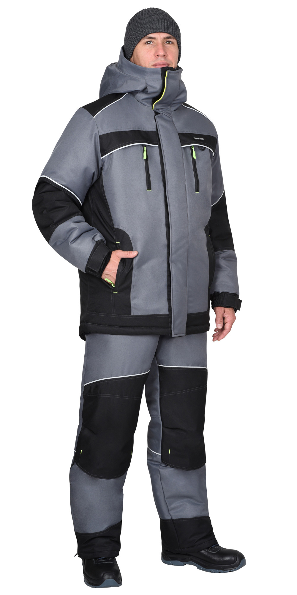 Костюм зимний 3 класса защиты предназначен для IV климатического пояса, состоит из куртки и брюк. В костюме предусмотрен СВ-кант для обеспечения сигнальной видимости.