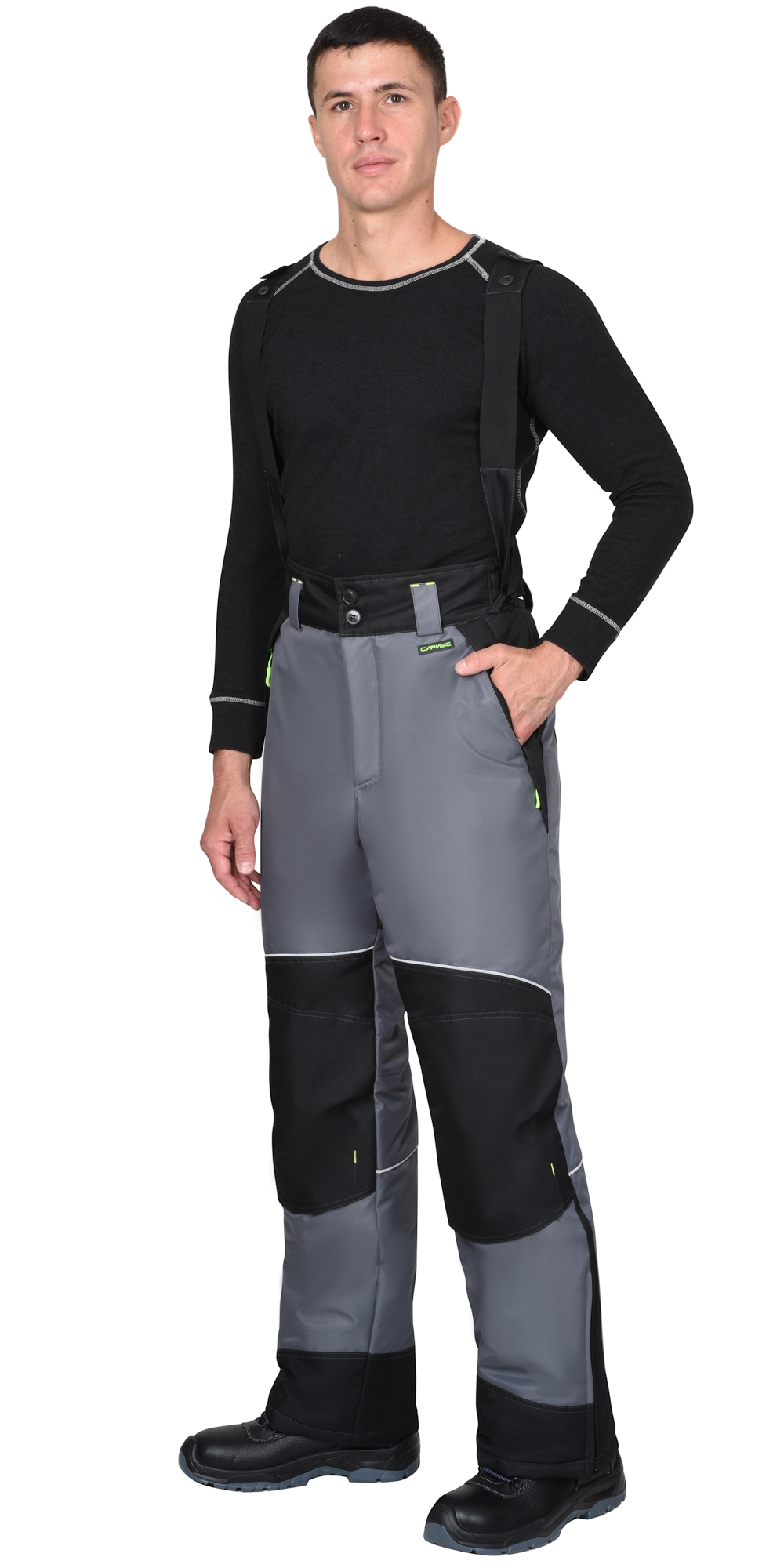 Брюки прямые, на утеплённой подкладке, с застежкой в среднем шве передних половинок на гульфик с молнией, с отрезным фигурным широким поясом с застежкой на пуговицы, со шлевками, с хлястиками по бокам на липучках, с внутренними боковыми карманами на молнию, с объемными наколенниками. Понизу боковых швов разрезы, застегиваются на молнию. В брюках предусмотрены петли для пристегивания бретелей и съемные бретели.