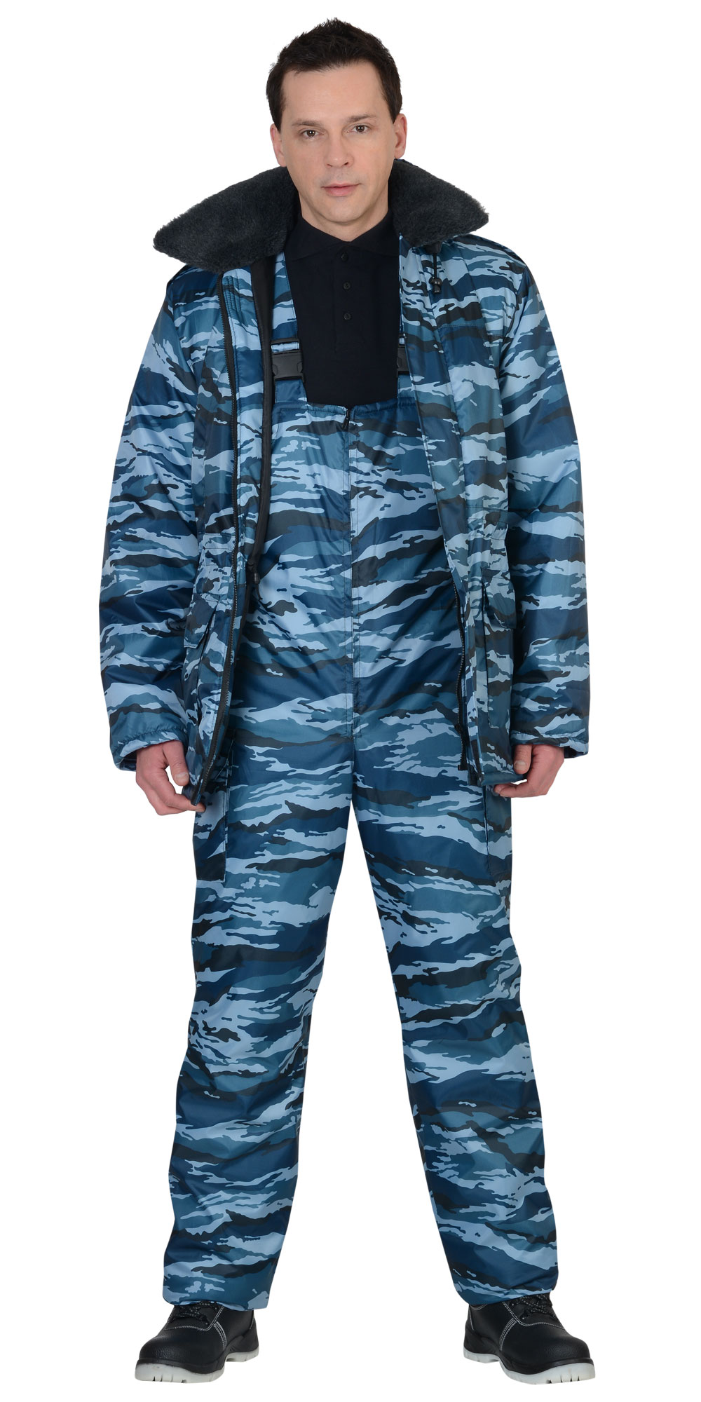 Костюм мужской утеплённый: куртка длинная, полукомбинезон. Куртка на молнии с ветрозащитным клапаном, съёмным капюшоном, накладными и прорезными карманами. Притачной меховой воротник, кулиска по линии талии, трикотажные манжеты внутри рукавов обеспечивают дополнительную теплозащиту. Полукомбинезон с центральной застёжкой-"молнией" и двумя боковыми накладными карманами.Тк. "Оксфорд", 100% п/э. Утеплитель: синтепон, в куртке 450 г/кв.м., в полукомбинезоне 300 г/кв.м. Подкладка: 100% п/э. ГОСТ 12.4.303-2016