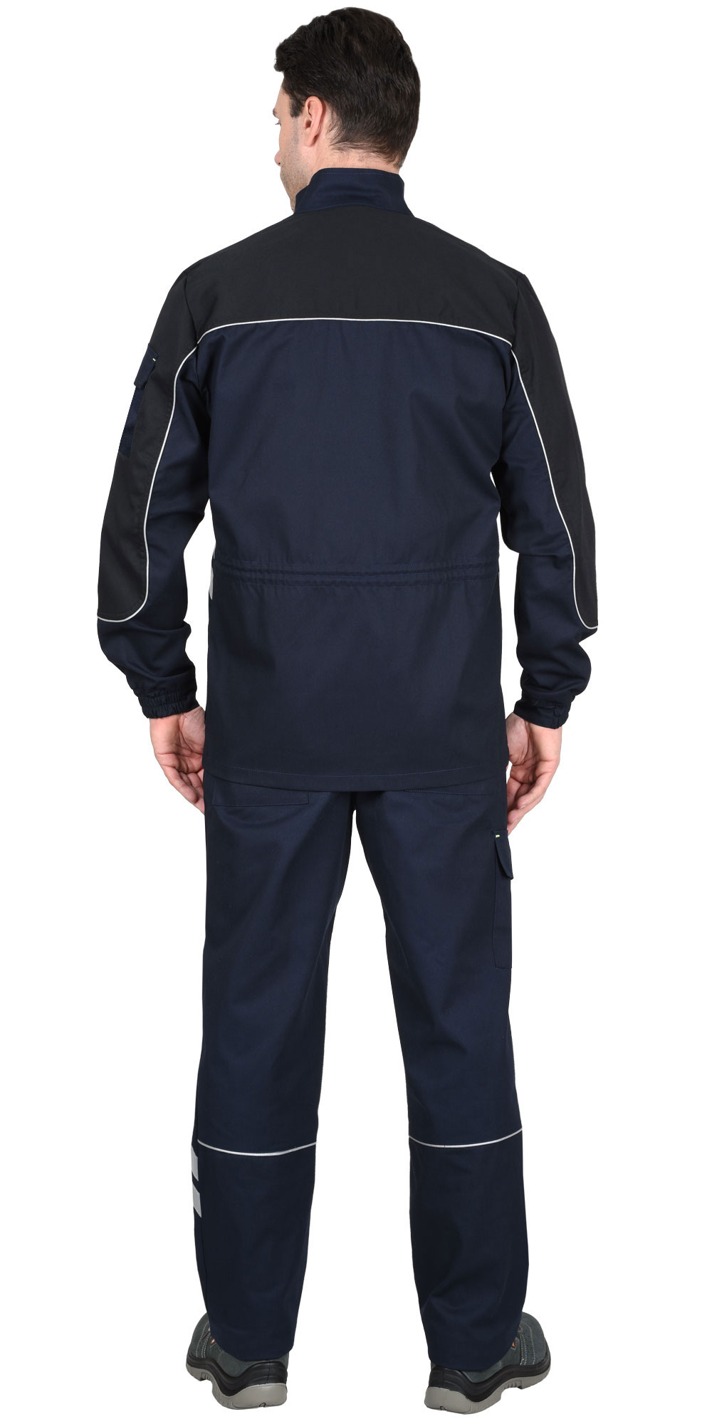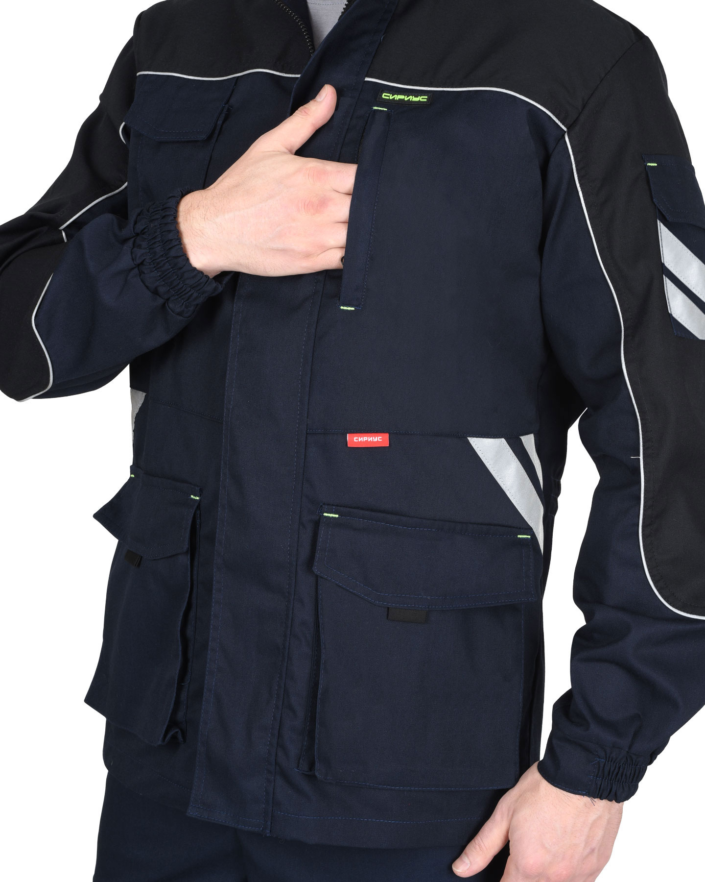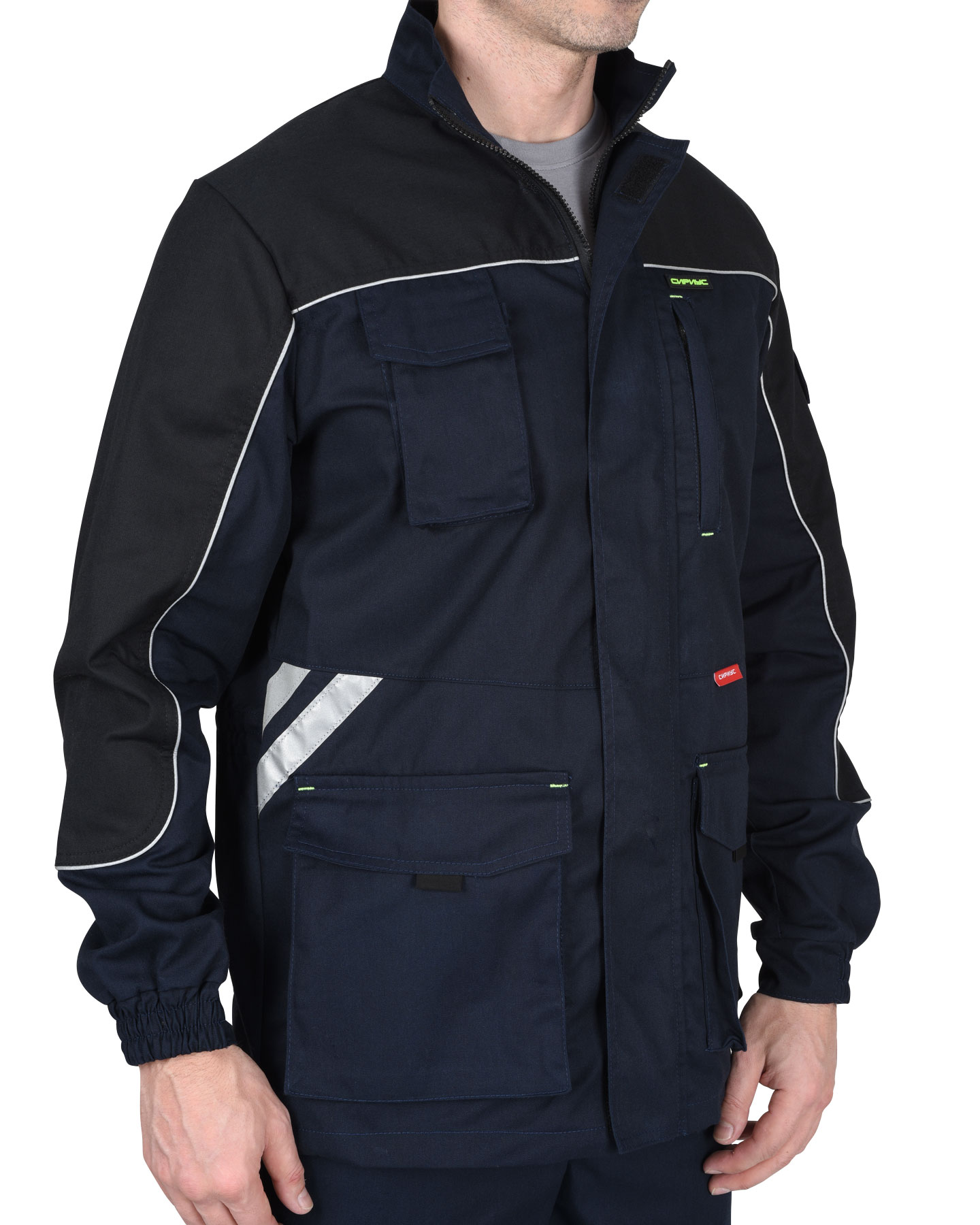 Куртка прямого силуэта, с центральной застежкой на молнию, накрытую ветрозащитным клапаном, с воротником стойка, с различными многофункциональными карманами, с элементами из СВ канта и СОП, обеспечивающие безопасность работы в условиях пониженной видимости.