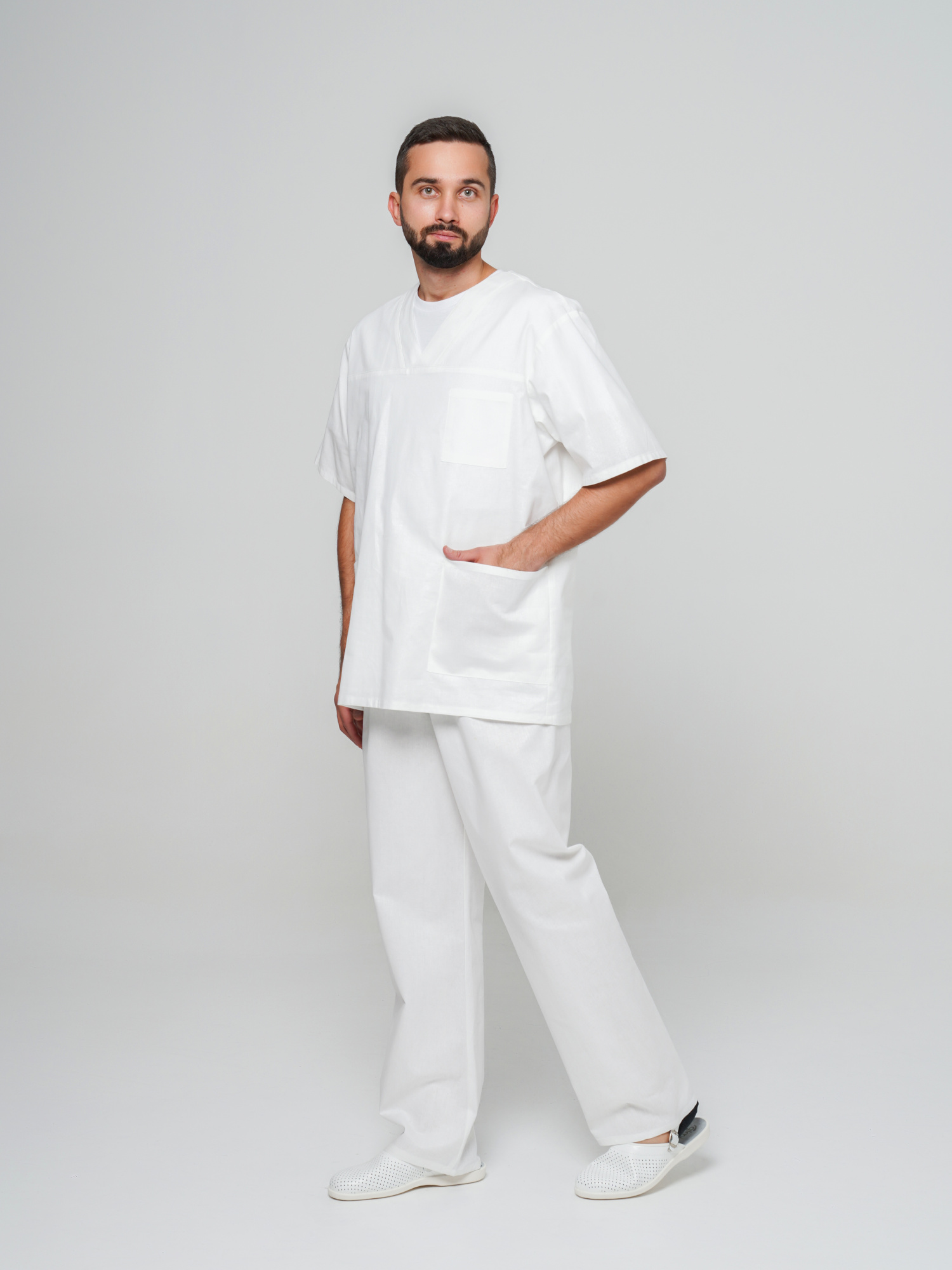 Костюм состоит из блузы и брюк. Блуза с V-образным вырезом горловины, с левым нагрудным карманом и двумя боковыми накладными карманами. Брюки с резинкой в поясе.