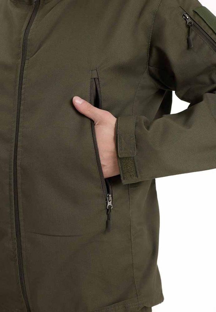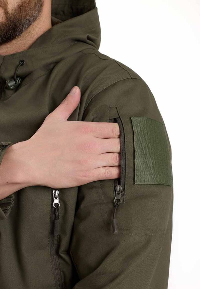 - в верхней части рукавов прорезные карманы в рамку со входом на молнию и ограничителями с двух сторон для замка, на кармане широкая липучка под шеврон;