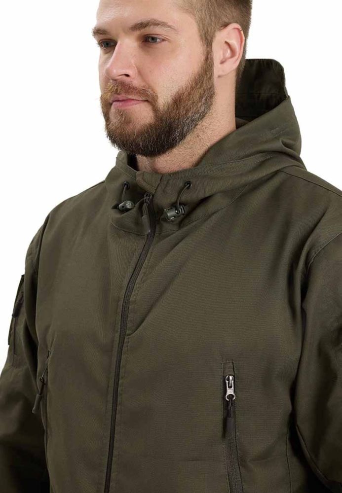 - капюшон с козырьком и кулиской по лицевой части со шнуром-резинкой и фиксаторами, утяжка кулисы капюшона происходит через нагрудные карманы сквозь люверсы на мешковинах;