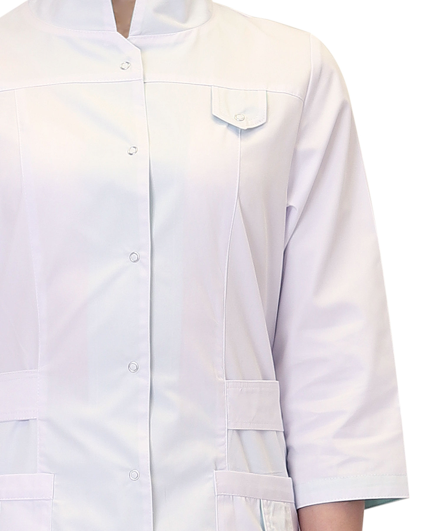 Костюм женский, комбинированный из ткани двух цветов, состоит из блузы белого цвета с отделкой и брюк из отделочной ткани. Блуза полуприлегающего силуэта с центральной сквозной бортовой застежкой на 6 кнопок. Воротник стойка. Два нижних накладных кармана. Рукава втачные, 3/4. Брюки прямые, с застёжкой на пуговицу и на тесьму «молния». Пояс частично стянут резинкой по боковым сторонам.