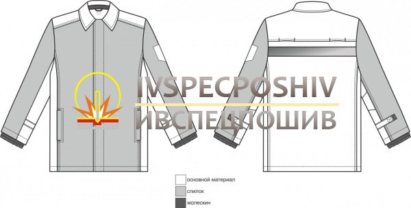 Куртка прямого силуэта с потайной центральной застежкой на 5 пуговиц. Форма рукавов соответствует основному положению рук сварщика при выполнении работ. Куртка имеет вентиляционные отверстия под проймами в боковом шве и по линии настрачивания кокетки.
