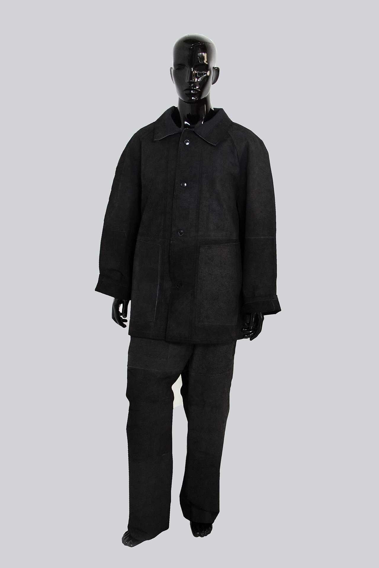 Куртка с застежкой на пуговицы, с двумя боковыми карманами в швах. На спине вентиляционные отверстия. Брюки с застежкой на пуговицах. Выполнен полностью из кожевенного спилка высокого качества. Обеспечивает защиту при работе с повышенными температурами: теплового излучения, искр и брызг расплавленного металла, а также при контакте с нагретыми поверхностями до 100 С и конвективным теплом.