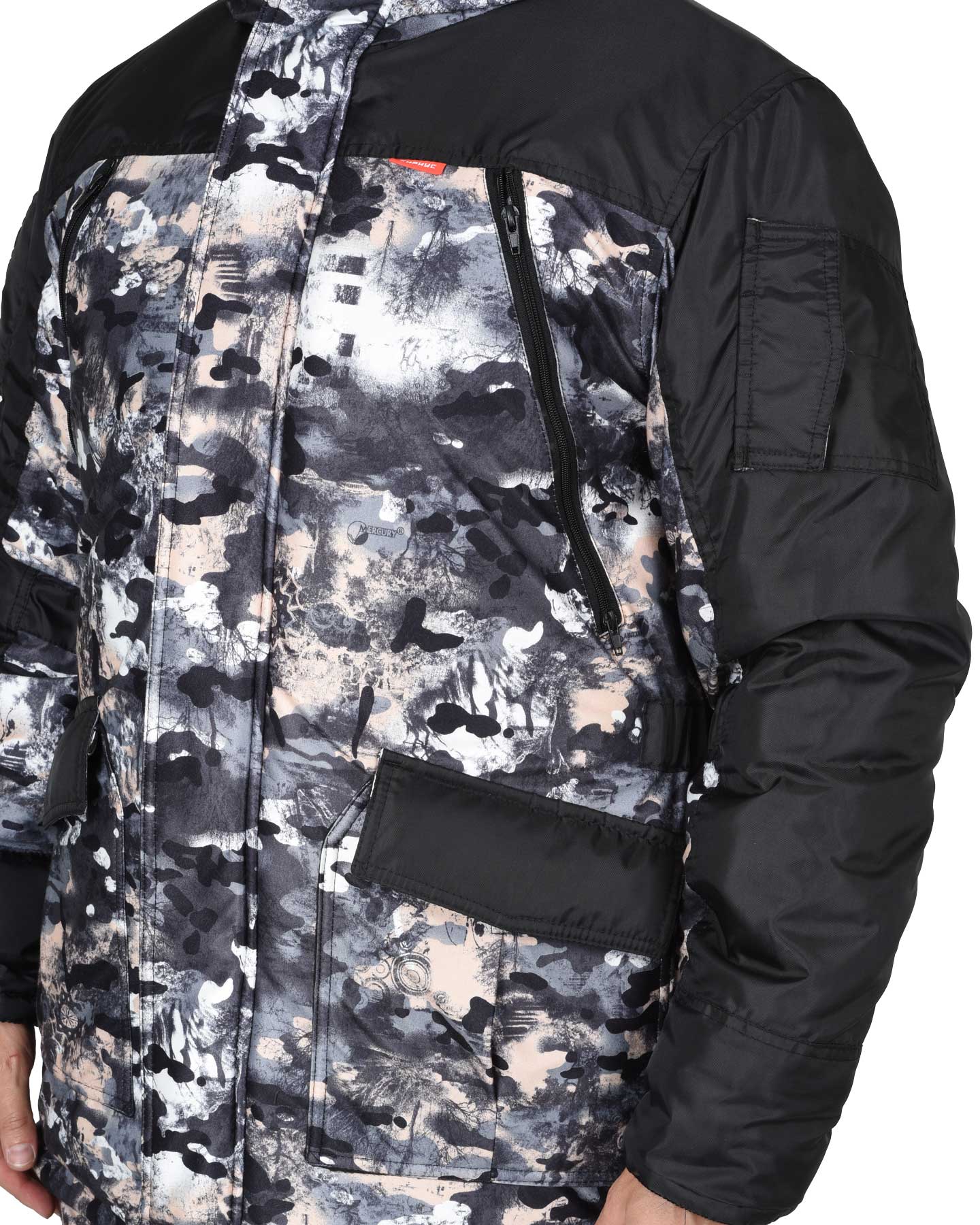 Куртка удлиненная прямого силуэта; с притачной утеплённой подкладкой, с центральной застёжкой на двухзамковую тесьму - «молнию» и ветрозащитным клапаном застегивающимся на потайные кнопки 5шт, с подпланкой, втачным капюшоном, верхними прорезными карманами застегивающимися на тесьму «молния», с нижними накладными фигурными полуобъемными карманами «антивор» и фигурными клапанами застегивающиеся на потайную кнопку. Рукава втачные, с полуобъемными накладными карманами и фигурными клапанами на кнопке. Капюшон с двумя кулисами для регулировки прилегания. Низ куртки регулирует шляпной резинкой и фиксатором. На подкладке внутренний карман на молнии.