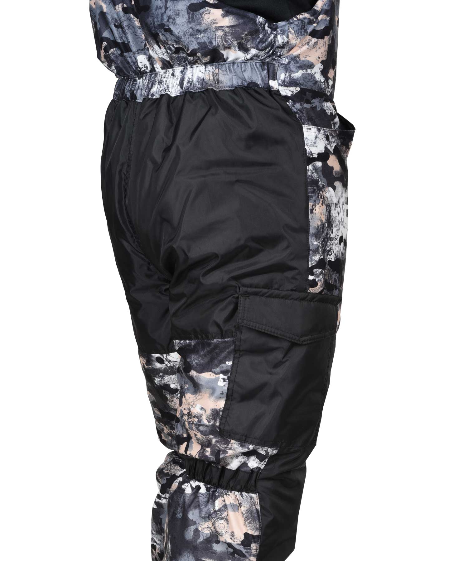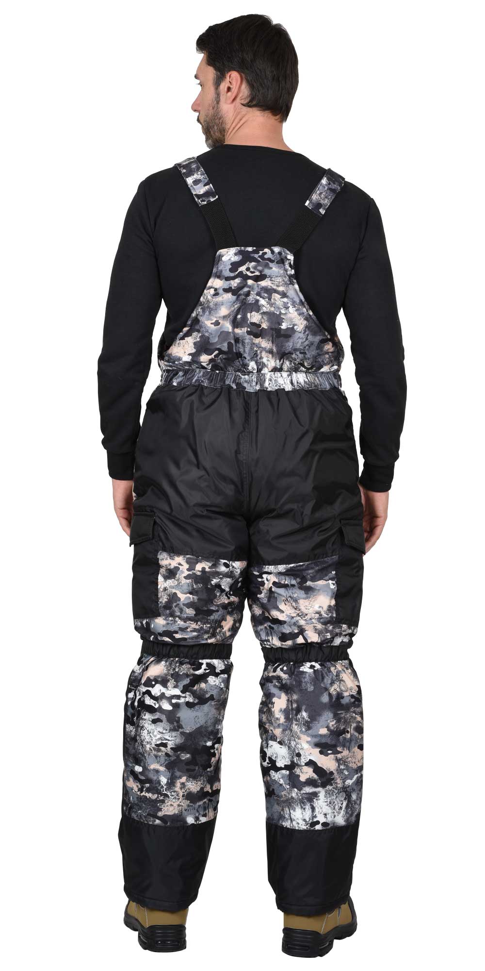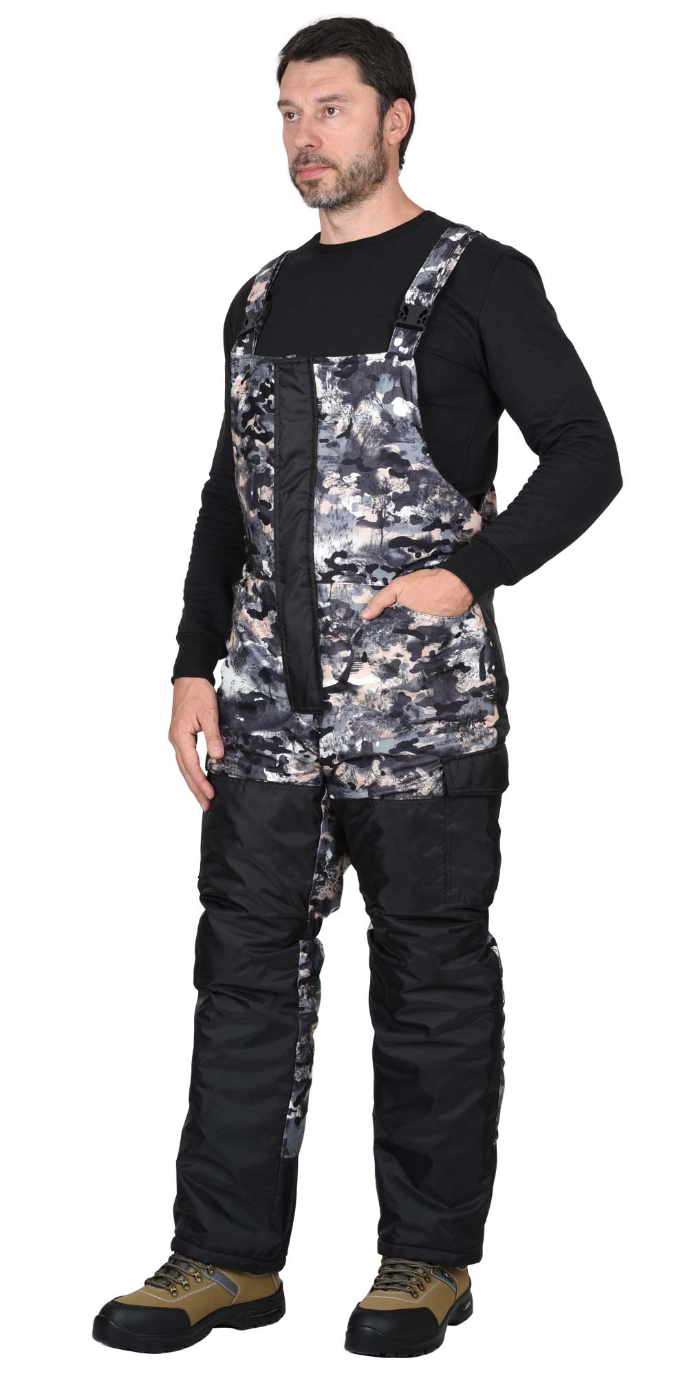 Полукомбинезон - прямой, утепленный, с центральной застёжкой на двухзамковую тесьму - «молния», с ветрозащитным клапаном, с притачными грудкой и спинкой, с внутренними боковыми карманами с фигурным входом, с боковыми накладными карманами на боковых швах брюк с фигурным клапаном, застегивающимся на потайную кнопку, с настрочным поясом, по спинке в поясе на всю ширину вставлена ткацкая резинка, в области колена стяжка по кулиске на ткацкую резинку. Полукомбинезон с бретелями, регулирующиеся за счет эластичной тесьмы и держателей-фастексов.