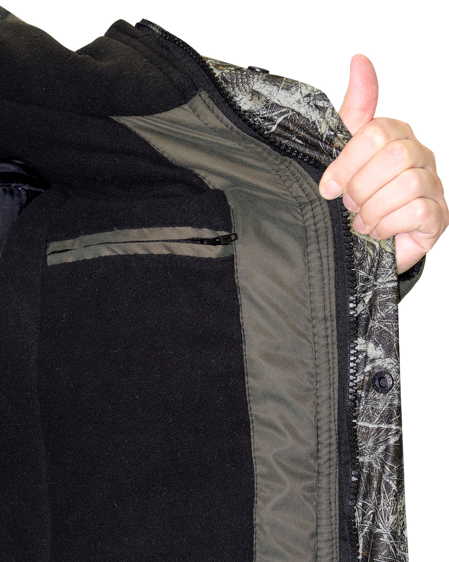 Куртка удлиненная прямого силуэта; с притачной утеплённой подкладкой, с центральной застёжкой на двухзамковую тесьму - «молнию» и ветрозащитным клапаном застегивающийся на потайные кнопки 5шт, с подпланкой, втачным капюшоном, верхними прорезными карманами застегивающиеся на тесьму «молния», с нижними накладными фигурными полуобъемными карманами «антивор» и фигурными клапанами застегивающиеся на потайную кнопку. Рукава втачные, с полуобъемными накладными карманами и фигурными клапанами застегиваются на потайную кнопку. Капюшон с двумя кулисами для регулировки прилегания. Низ куртки регулирует шляпной резинкой и фиксатором. На подкладке внутренний карман на молнии. Полукомбинезон - прямой, утепленный, с центральной застёжкой на двухзамковую тесьму - «молния», с ветрозащитным клапаном, с притачными грудкой и спинкой, с внутренними боковыми карманами с фигурным входом, с боковыми накладными карманами на боковых швах брюк с фигурным клапаном, застегивающимся на потайную кнопку, с настрочным поясом, по спинке в поясе на всю ширину вставлена ткацкая резинка, в области колена стяжка по кулиске на ткацкую резинку задних половинках полукомбинезона для лучшего прилегания, с бретелями регулирующийся за счет эластичной тесьмы и держателей-фастексов. Ткань верха: "Алова" мембрана, состав - 100% п/э, КМФ "Змея". Ткань верха отделочная: «Токио» с ВО пропиткой: состав 85% п/э 15% нейлон. Подкладочная ткань: «Таффета», состав: 100 % - п/э.Утеплитель: Синтепон - 150 г/м2, в куртке - 3 слоя (итого 450 г/м2), в п/к - 2 слоя (итого 300 г/м2).