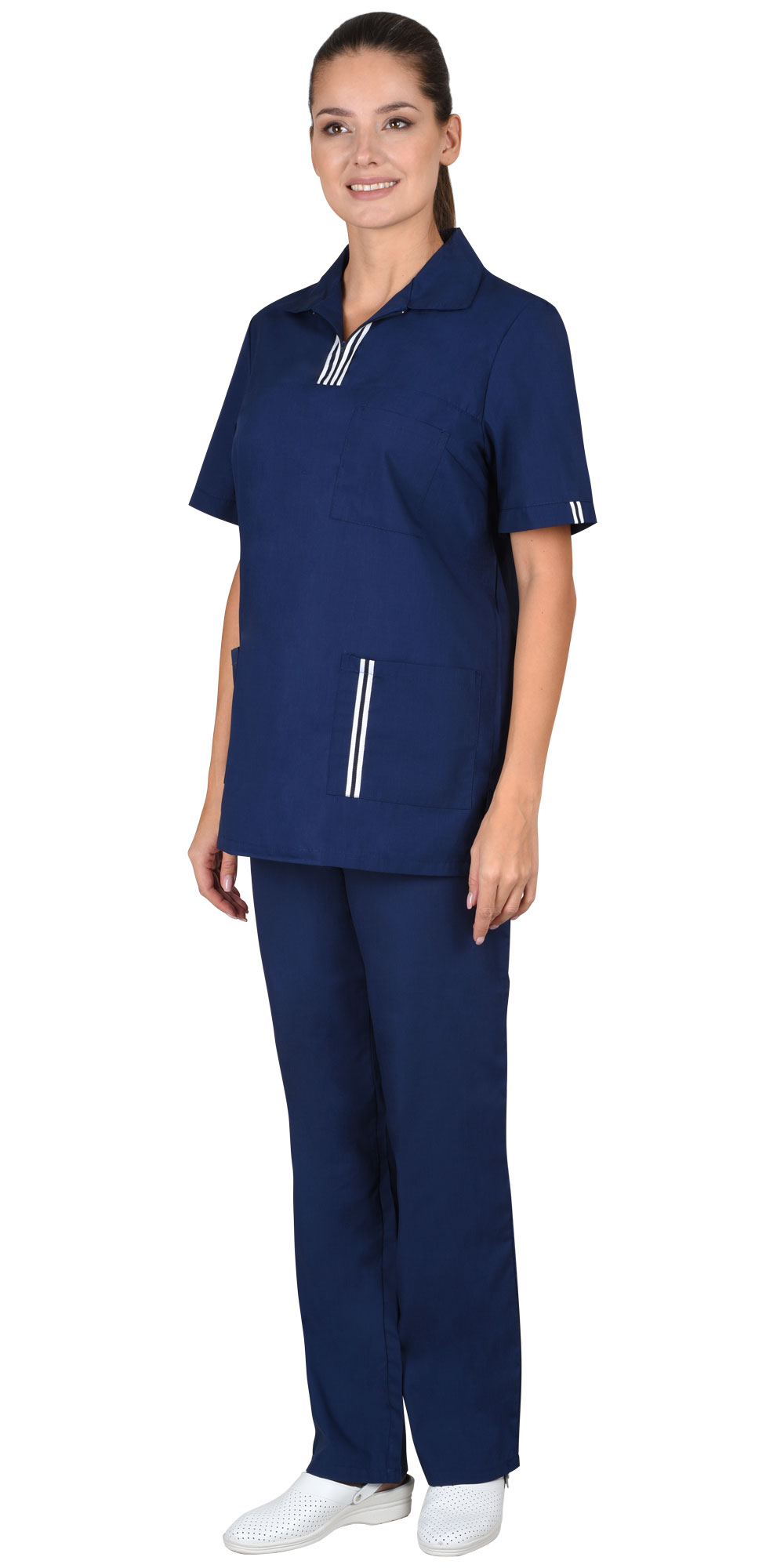 Костюм состоит из блузы и брюк. Блуза прямого силуэта с застежкой на тесьму "молния" в области кокетки. Отложной воротник. Нагрудный левый и два нижних накладных кармана. Рукава втачные, короткие. По низу блузы разрезы в боковых швах.
