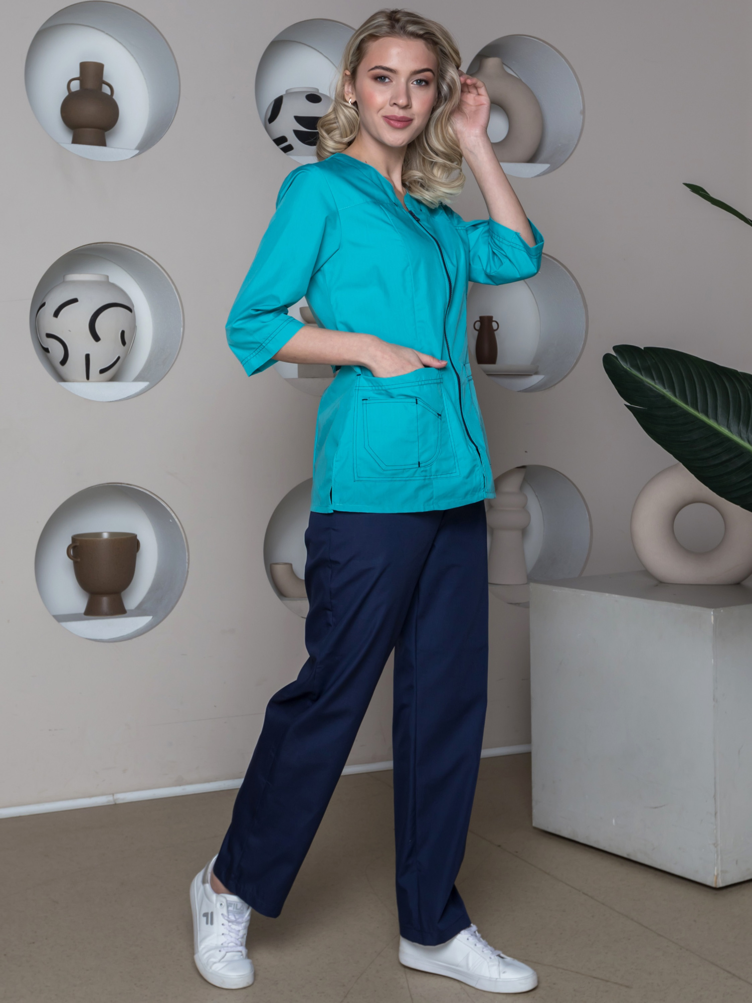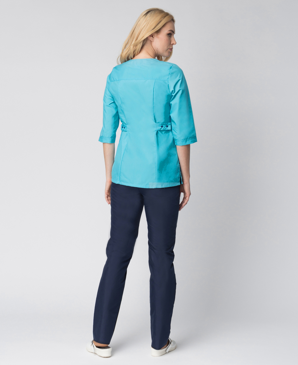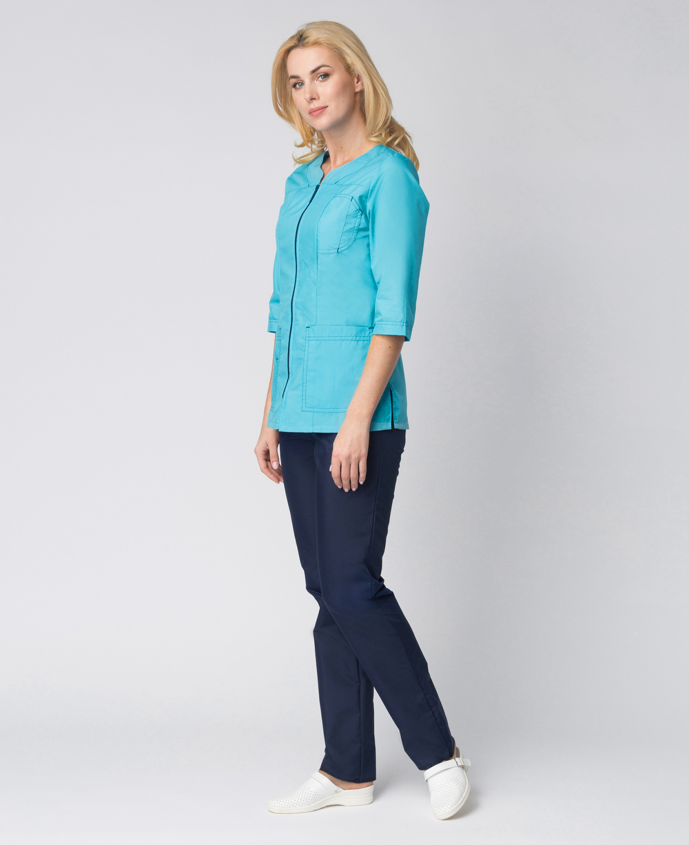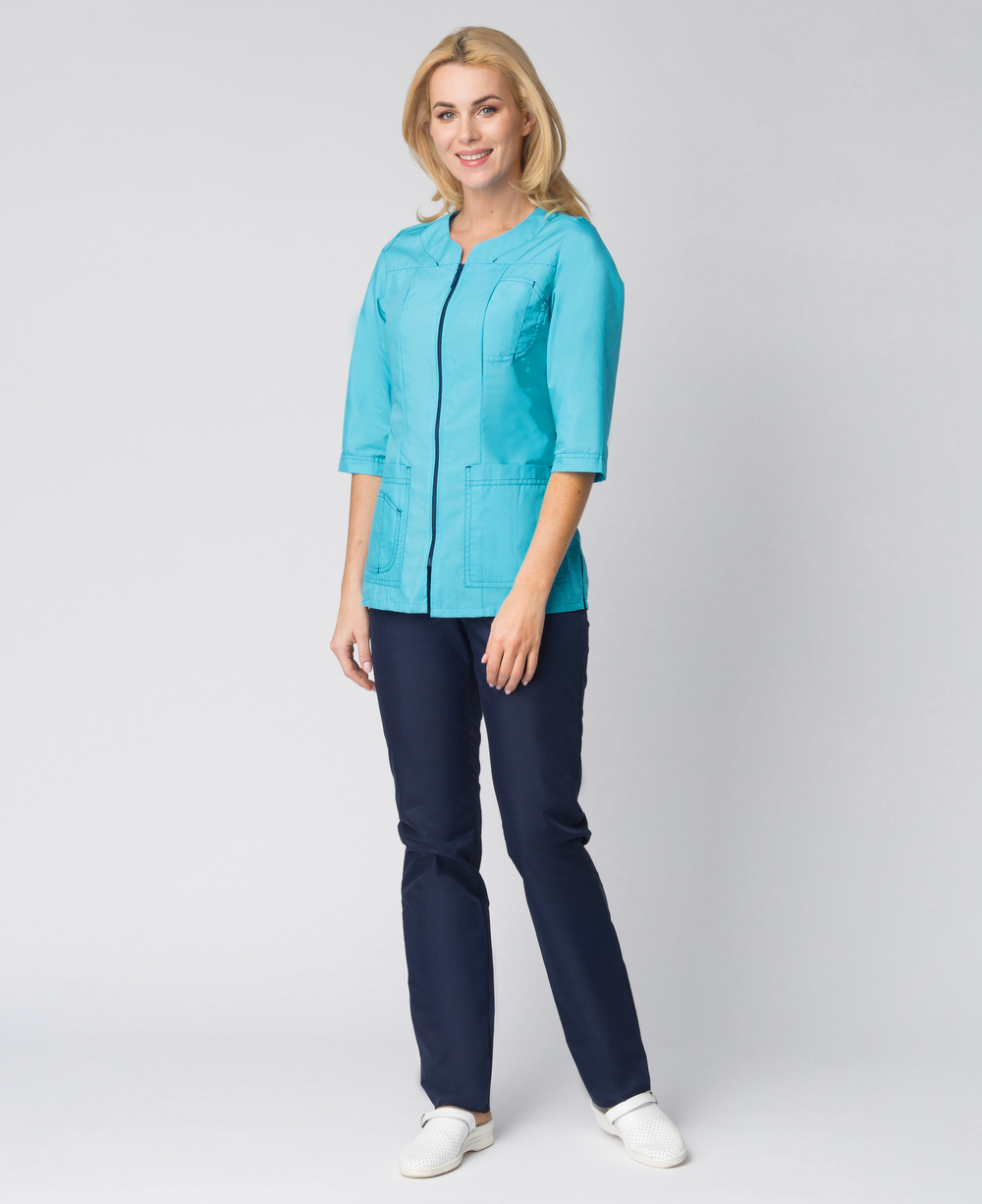 Костюм женский рабочий «Спринт» изготовлен в изысканных бирюзовых и синих оттенках в соответствии с ГОСТ. Спецодежда женская защищает от общих производственных загрязнений, механических воздействий и может выступать как медицинская форма, рабочая одежда для салонов красоты, массажных кабинетов и стоматологий. Костюм состоит из двух предметов: блуза женская и брюки. Элегантная блузка полуприталенного силуэта не стесняет движения, подчеркивает линию талии, удобно застегивается на «молнию». Оригинальные карманы с контрастной прострочкой придают костюму стильный внешний вид, практичны в повседневной деятельности. Прямые рабочие брюки с поясом на резинке замечательно сидят по фигуре, комфорты для работы. Модель брюк универсальна для женщин разного роста, т.к. регулируется по длине. Премиальные материалы рабочей одежды отличаются износостойкостью, приятны на ощупь
