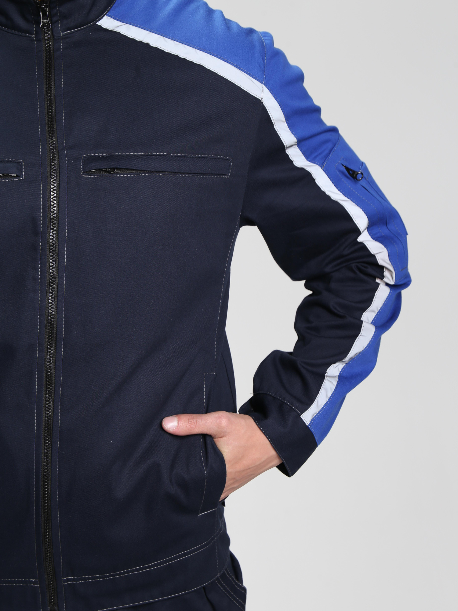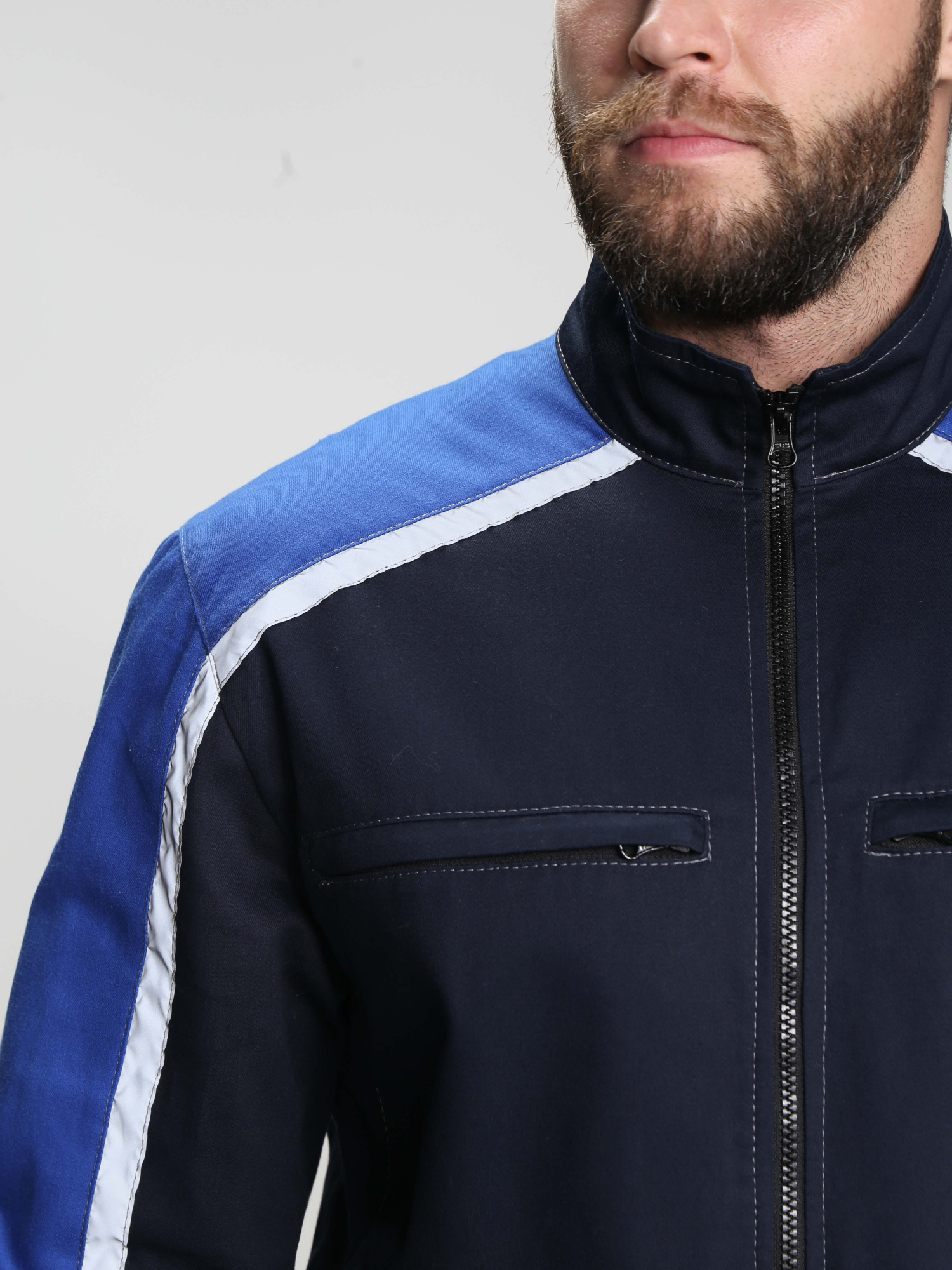 Настроченные светоотражающие полосы (СОП) на кокетках полочек и спинки, а также на рукавах, повышают видимость и безопасность работника в условиях плохой освещённости.