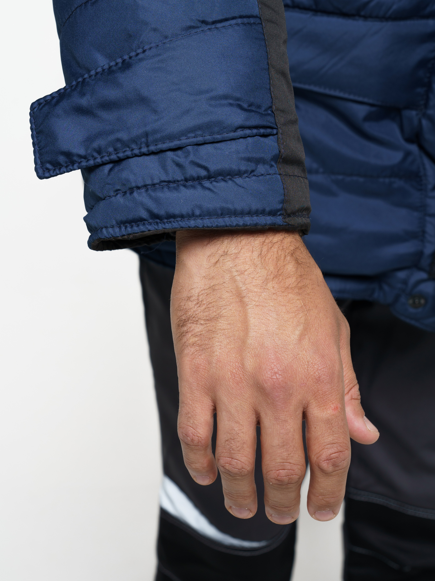 Куртка прямого силуэта; с горизонтальными строчками настрачивания слоя утеплителя на детали полочек, спинки, рукавов; воротник - «стойка»; с тесьмой «молния» по горловине, скрытой под планкой, для пристёгивания капюшона; с центральной бортовой застёжкой на двухзамковую тесьму «молния» и двумя внешними ветрозащитными клапанами, застёгивающимися на 4 текстильные застёжки «липучки» длиной 9,5см и одну кнопку, по низу планки; с внутренним ветрозащитным клапаном правой полочки (от верхнего края воротника до низа куртки), из ткани подкладка.