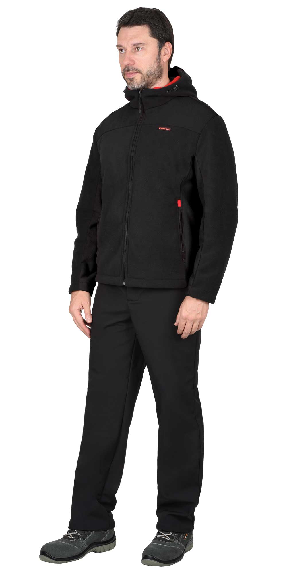 Куртка, комбинированная из флиса двух цветов, без подкладки, прямого силуэта, с центральной застежкой на молнии с втачным капюшоном, с тремя карманами на молнии. Рукава втачные понизу присобраны на окантовочную резинку. Капюшон втачной. ГОСТ 25295-2003