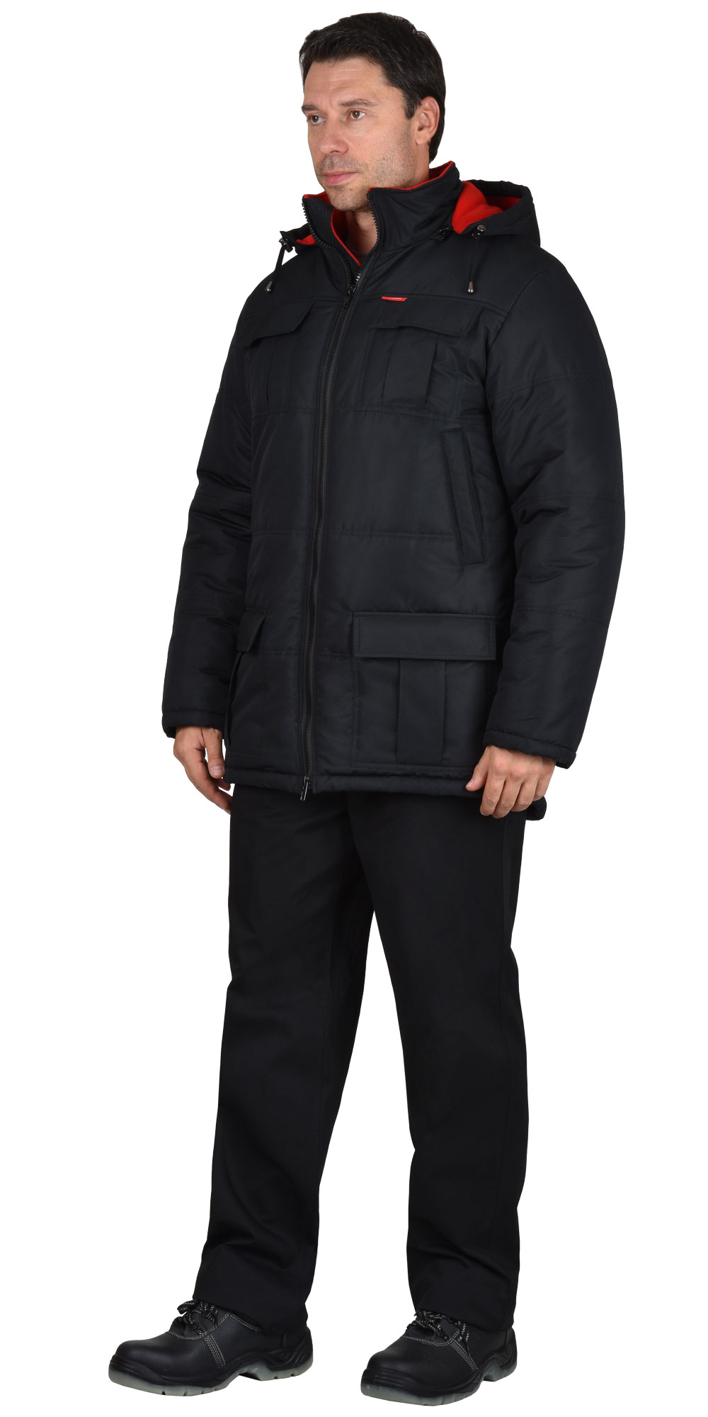 Куртка мужская, длинная, стеганая; с притачной утеплённой подкладкой; с фигурной линией низа спинки; с центральной застёжкой на двухзамковую тесьму - «молния» до верха; с внутренней подпланкой простёганной 5-ю отделочными строчками; с воротником-стойка; с утепленным пристегивающимся капюшоном на тесьму - «молния»; нагрудными накладными карманами с клапанами застегивающиеся на потайную ленту «контакт» и складками для объема; в средней части полочки прорезные карманы в «листочку» застегивающиеся на потайную кнопку д.15мм 1шт; с нижними накладными карманами с клапанами застегивающимся на потайную ленту «контакт» и складками для объема; с внутренним накладным карманом на подкладке на тесьму – «молния». Рукава втачные, двухшовные. Ткань верха: «Таслан» ВО и ПУ МИЛКИ пропиткой, состав: 100% п/э; Ткань подкладочная: «Флис» состав: 100% п/э, пл. 180г/м2, Утеплитель - «Синтепон» 150г/м2 – 2 слоя. ГОСТ 25295-2003.