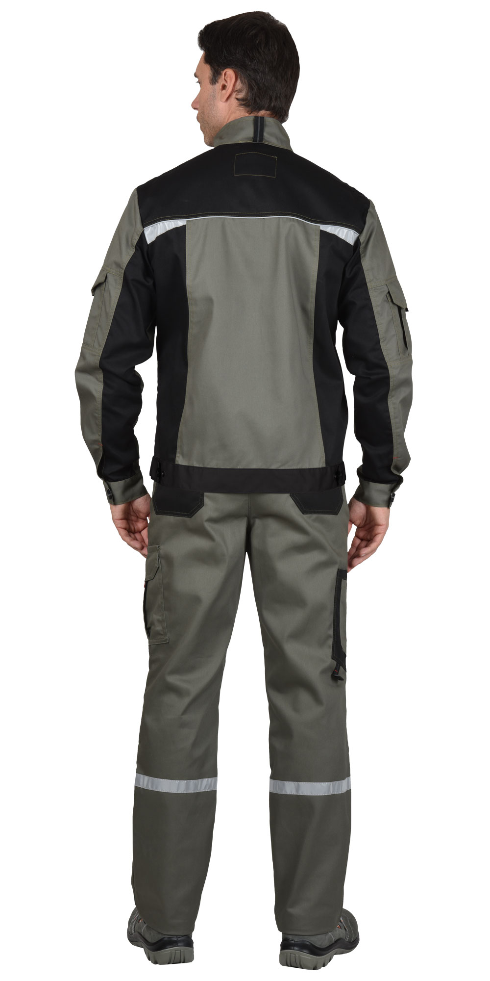 Куртка короткая прямого силуэта, с центральной застёжкой на молнию с ветрозащитной планкой с кнопками и липучками, с поясом. Воротник "стойка" с декоративной шлевкой сзади. Полочки с нагрудными накладными карманами с клапанами на липучки, карманы со складками из отделочной ткани. На правом нагрудном кармане, по середине декоративная лента с пластмассовым полукольцом. Нижние карманы в рельефах с отстрочкой в виде "листочки". Рукава с манжетами на кнопках и с накладными карманами с клапанами на липучках, левый карман со складкой. Куртка по низу регулируется сзади патами с кнопками. Предусмотрены световозвращающие элементы для обозначения сигнальной видимости