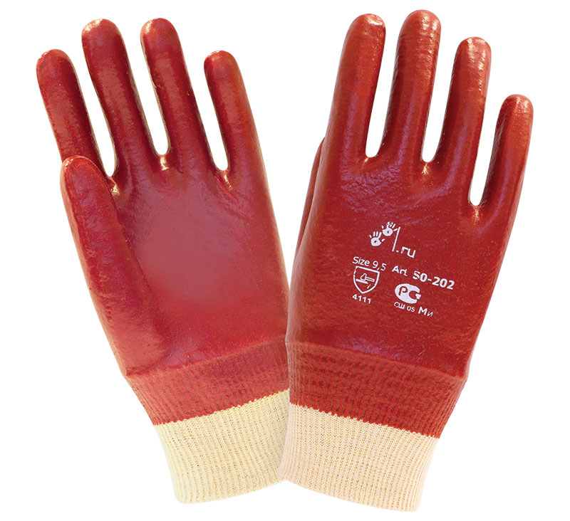 Перчатки с ПВХ покрытием 2Hands ЕСО (Ту Хэндс ЭКО) для защиты от механических воздействий. 100% хлопковая основа с полным ПВХ покрытием, манжет резинка. Хорошая  чувствительность и защита от истирания, стойкость к разрыву и зацепам, ограниченная стойкость к слабым растворам агрессивных веществ (не обеспечивают защиту от химических рисков  выше 1 кат по EN 374), герметичны. Размер 10,5. Рекомендованы к применению во всех сферах производства от сборочных работ до строительства. Обладают преимуществом перед перчатками с нитриловым покрытием при работах в холодное время, т.к. обладают большей эластичностью при низких температурах. Часто перчатки этого типа называют "МБС", что является ошибкой, т.к. наличие ограниченной защиты от масел, нефти и других агрессивных жидкостей, не может быть достаточным основанием, для их определения как  МБС – маслобензостойкие. Путем составления сложных смесей полимеров и пластификаторов получают ПВХ перчатки с разными уровнями химической защиты. Если перчатки действительно МБС, на них обязательно должна быть соответствующая маркировка, например, как в серии Alaska+: 3027 или 3035.