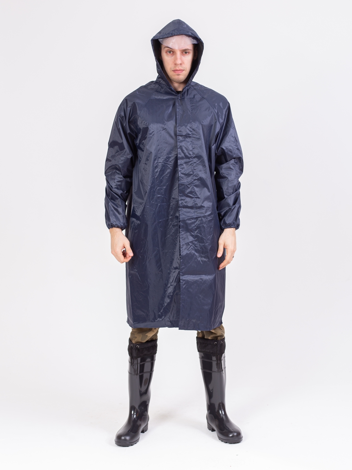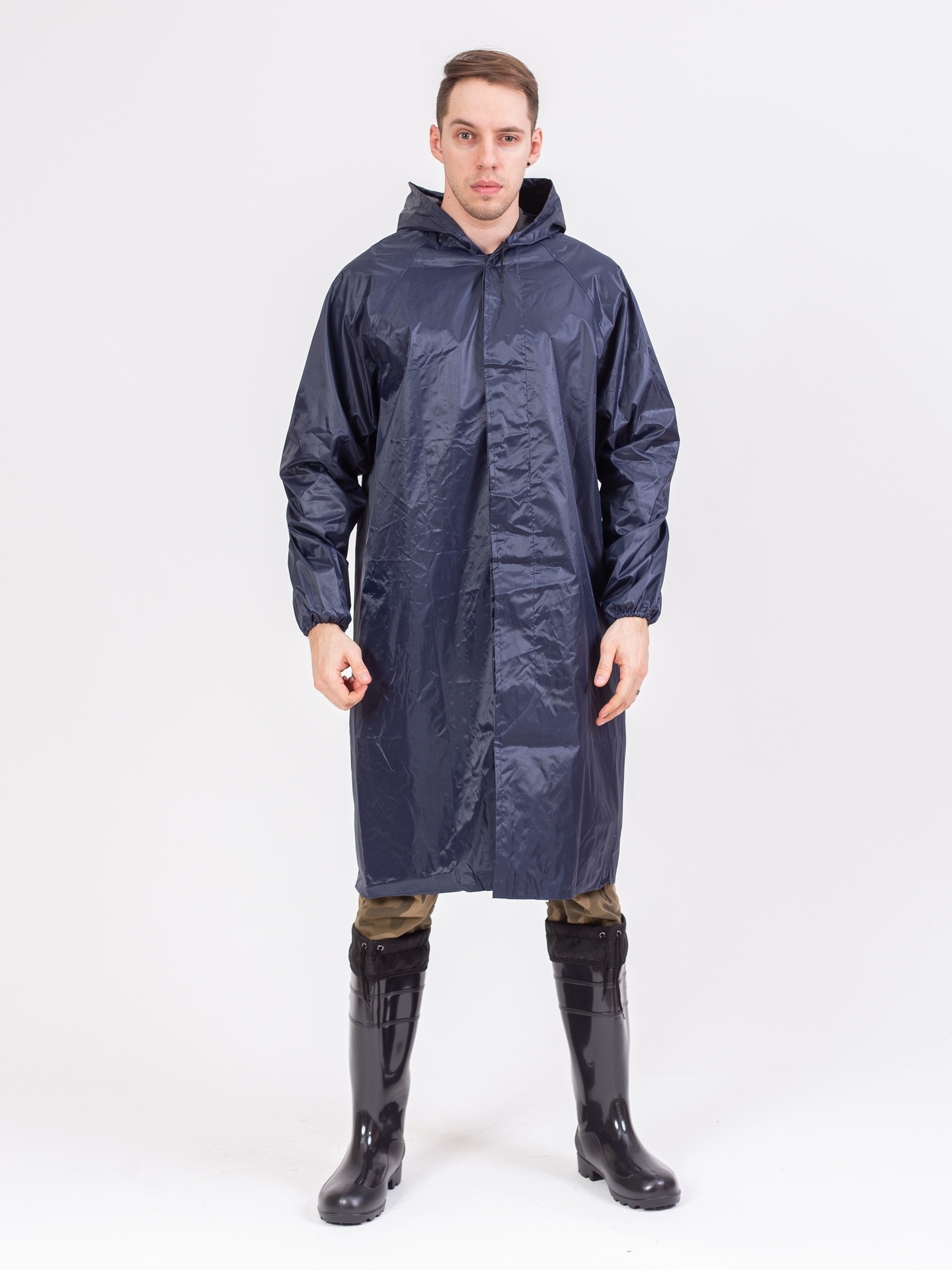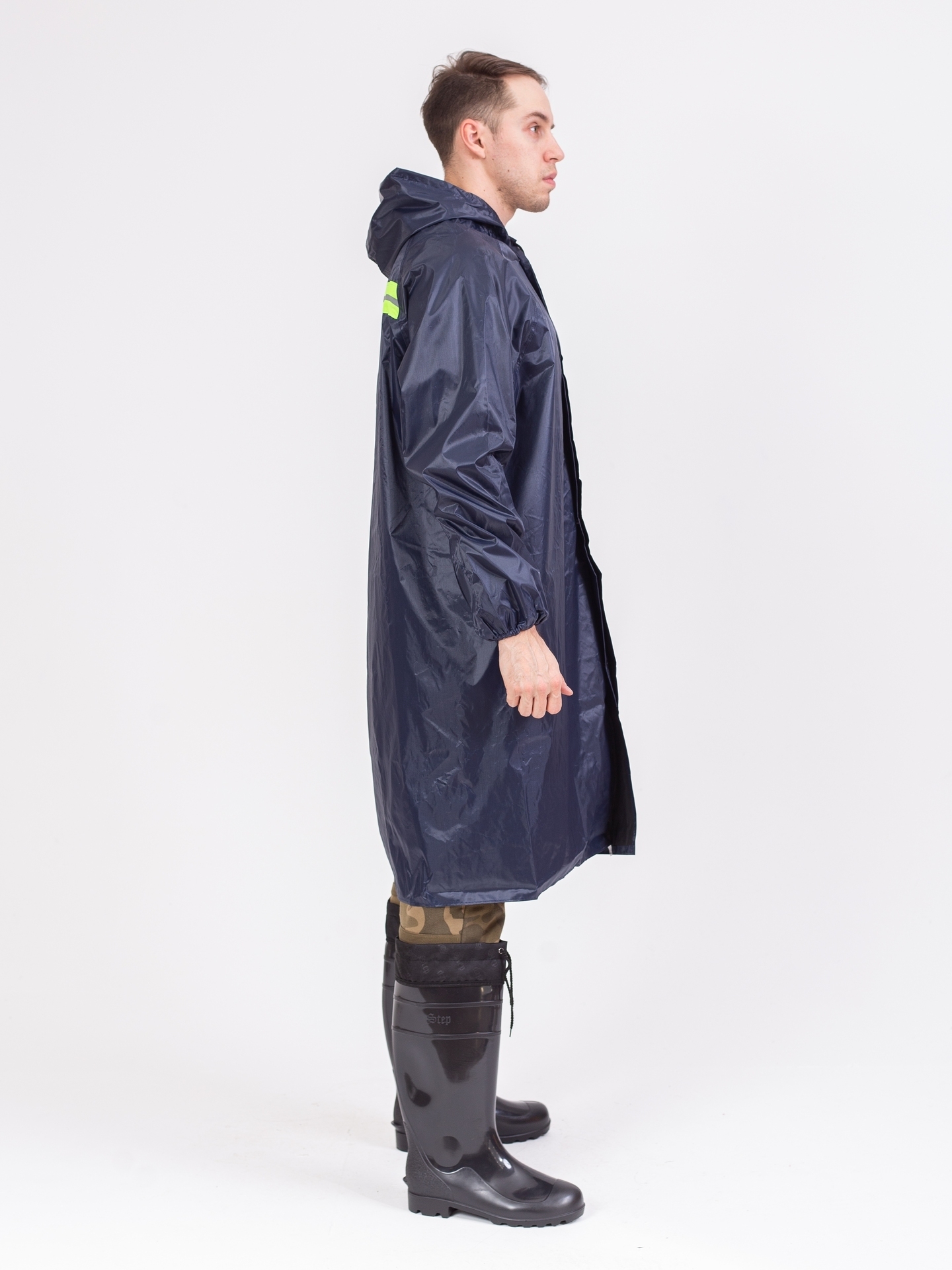 Плащ с застежкой на кнопках, отложной воротник, имеет капюшон, прошитые и герметично проклеенные швы, манжеты резинки на рукавах. Объем капюшона регулируется по лицевому вырезу шнуром с наконечниками.