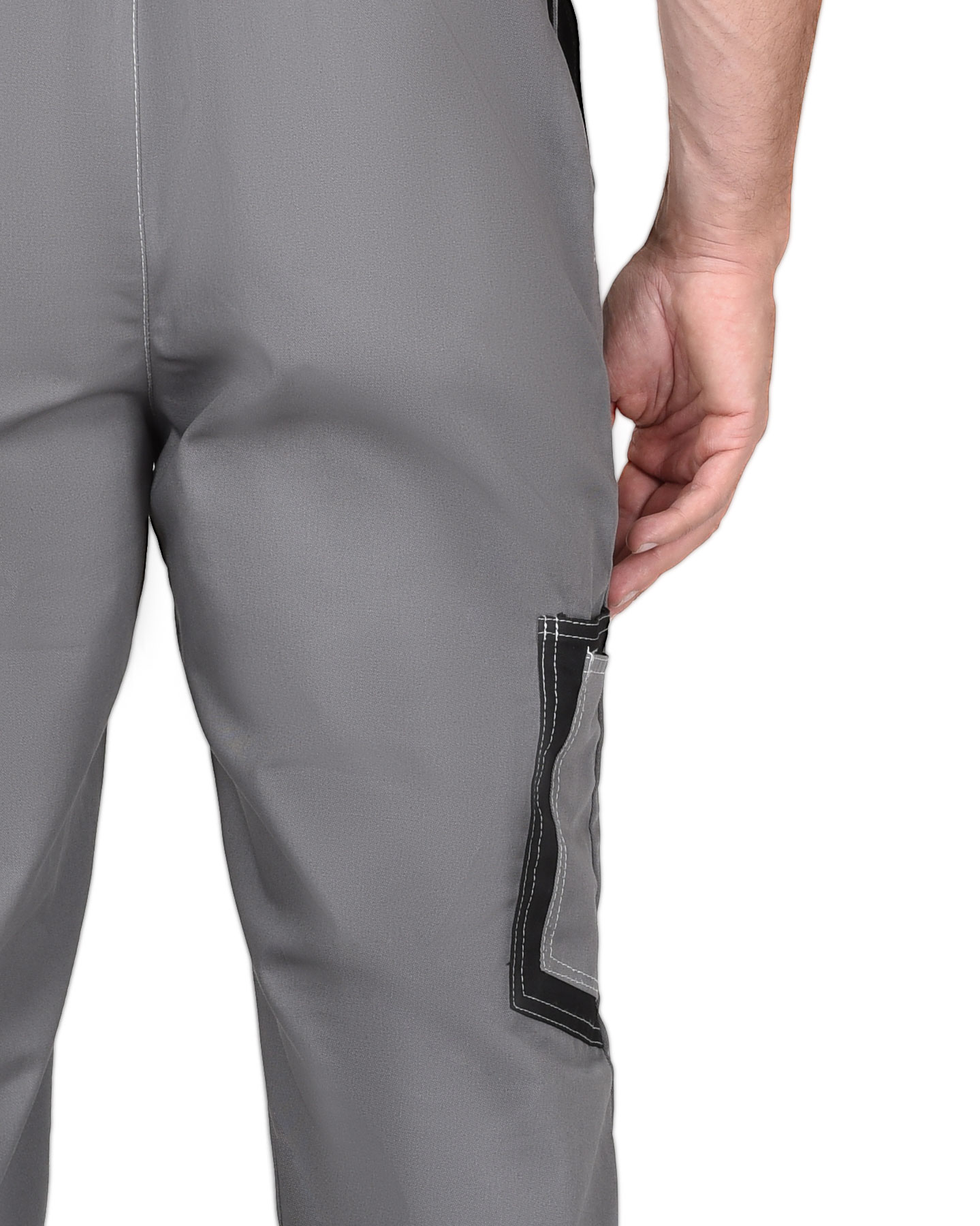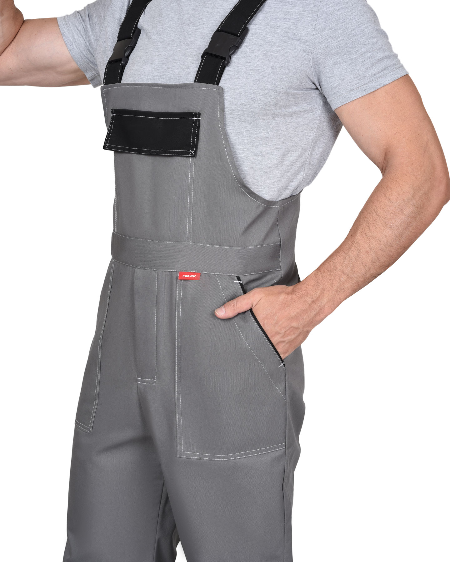 Полукомбинезон прямой, с застёжкой гульфика спереди и с застежкой в правом боковом шве на пуговицы. Изделие с накладным карманом и клапаном на нагруднике на липучке, боковыми накладными карманами с наклонным входом и с карманами для инструментов на правой задней половинке полукомбинезона.