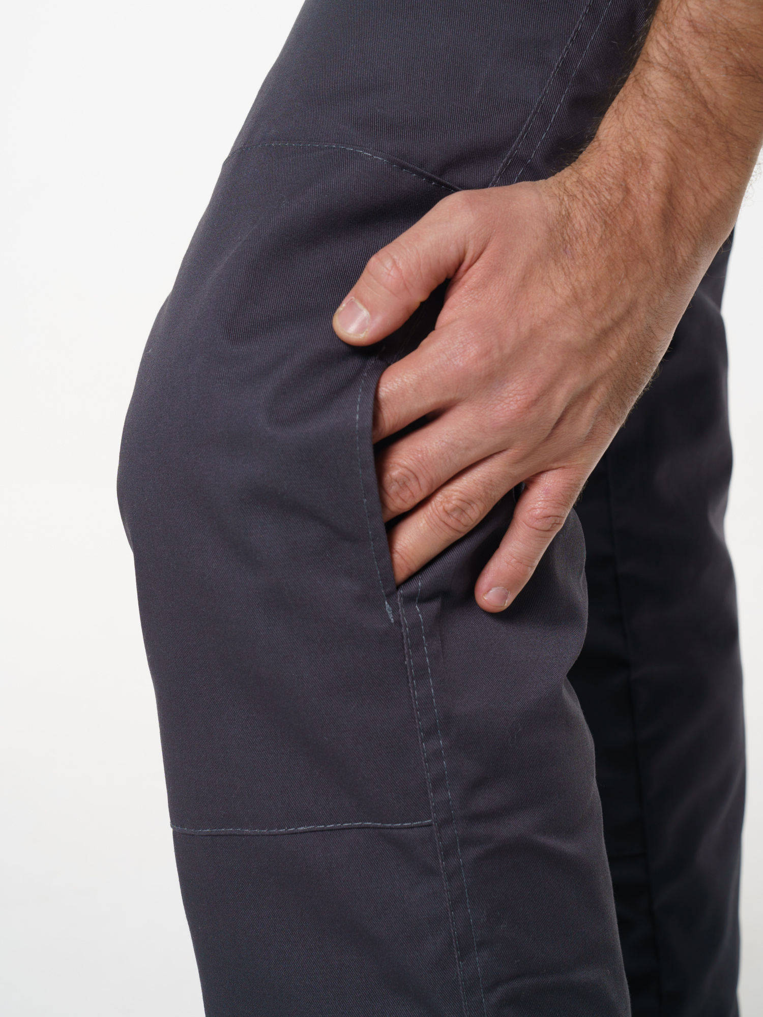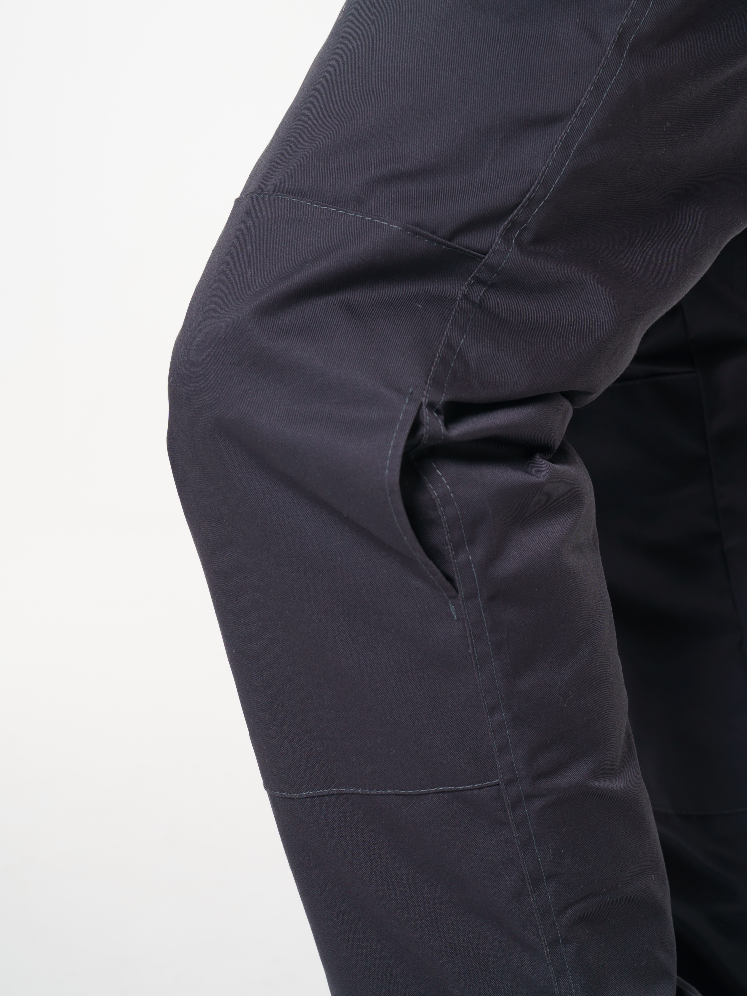 Полукомбинезон прямого силуэта с центральной застежкой на молнию. С высокой грудкой и спинкой, на регулируемых бретелях с резинкой и фастексами. Объемные боковые накладные карманы с косым входом. По талии спинки кулиса на резинке. Усилительные вставки в зоне коленей с возможностью установить наколенники.
