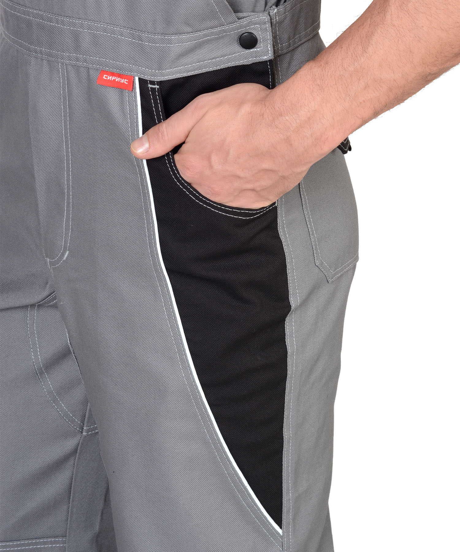 Полукомбинезон выполнен из ткани "Панакота Комфорт", с застежкой гульфика на молнию, с застежкой по боковым швам на 2-е кнопки, с фигурным карманом и клапаном на нагруднике, с боковыми карманами с закругленным входом. Изделие с накладными задними фигурными карманами, правый карман с застежкой на молнии, левый карман с клапаном с застежкой на кнопку. Полукомбинезон с наколенниками на передних половинках и с СВ кантом на задних половинках. В полукомбинезоне предусмотрено усиление с помощью накладок в области средних швов на передней и задней половинках и по низу шагового шва.
