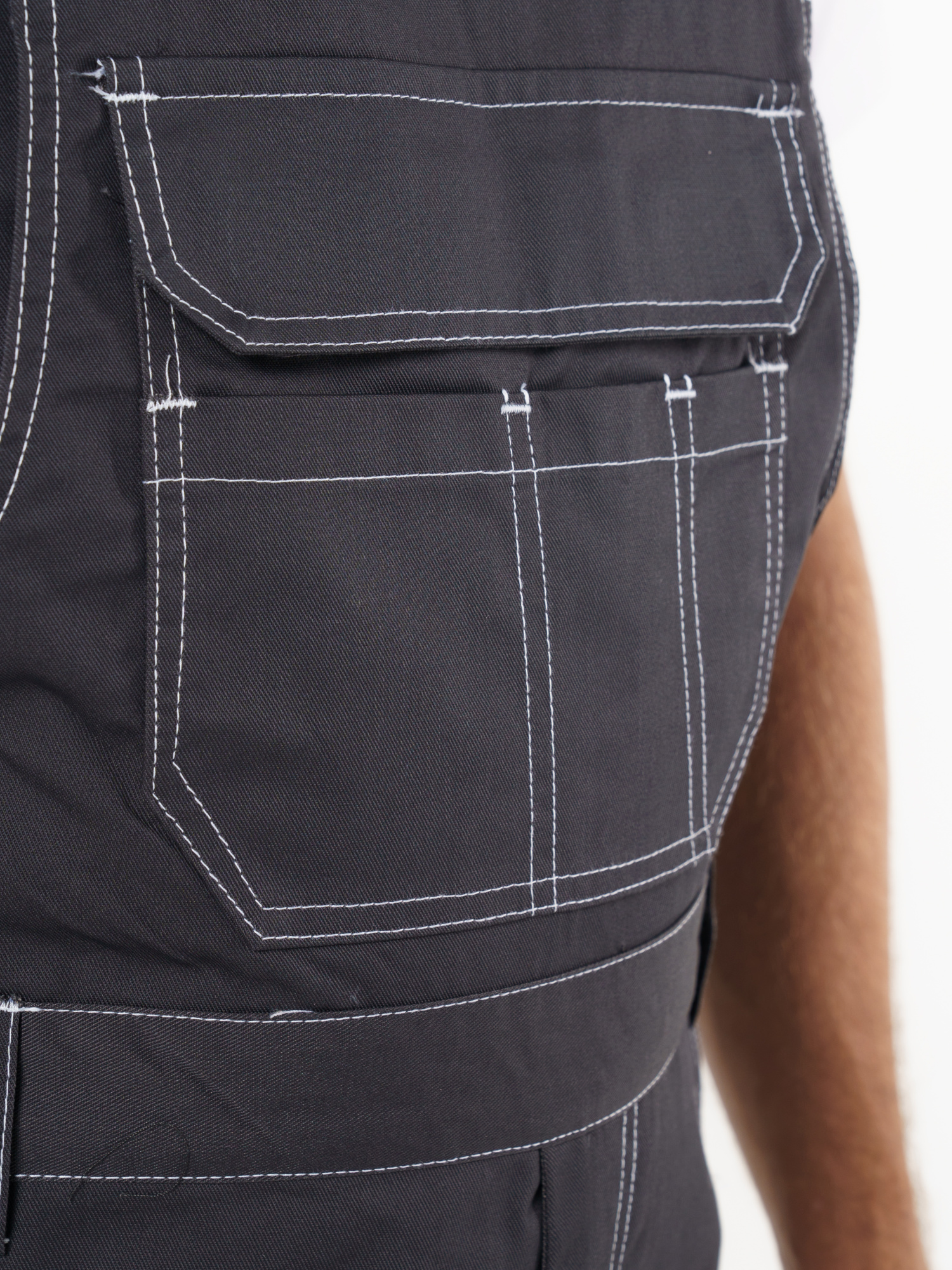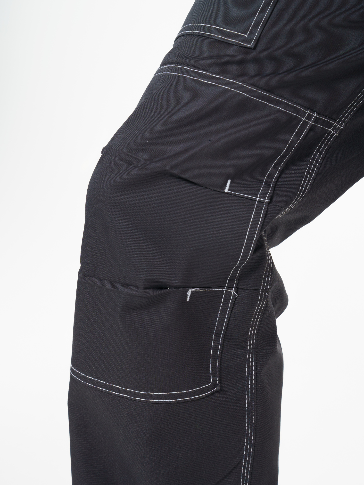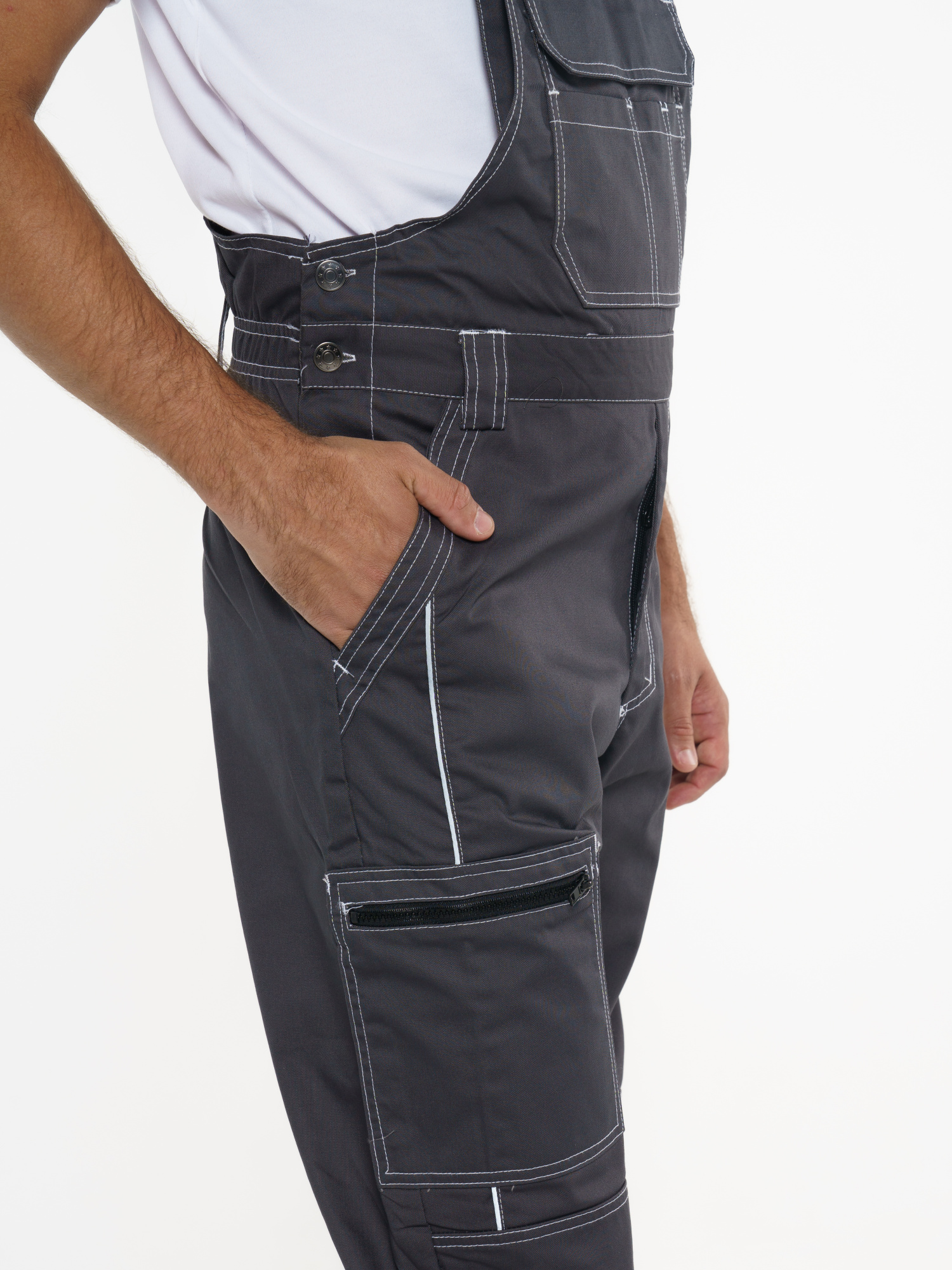 Полукомбинезон прямого силуэта, застежкой гульфика на молния, с различными многофункциональными карманами, с застежкой в правом боковом шве на пуговицы, с наколенниками, с бретелями регулируемыми эластичной тесьмой и фастексами, с эластичной тесьмой по линии талии, на передних половинках в рельеф вшивается СВ кант.
