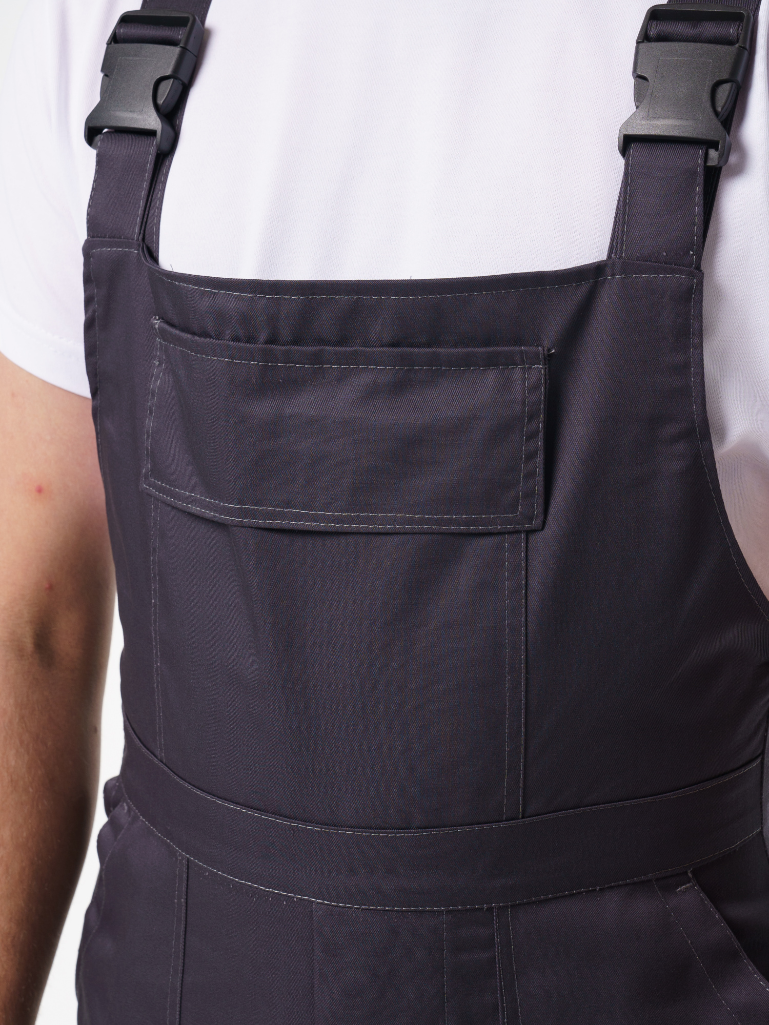 Полукомбинезон прямого покроя, с застёжкой гульфика и застёжкой в правом боковом шве на пуговицы, с карманом и клапаном на нагруднике, с боковыми накладными карманами. Есть СОП по низу полукомбинезона.