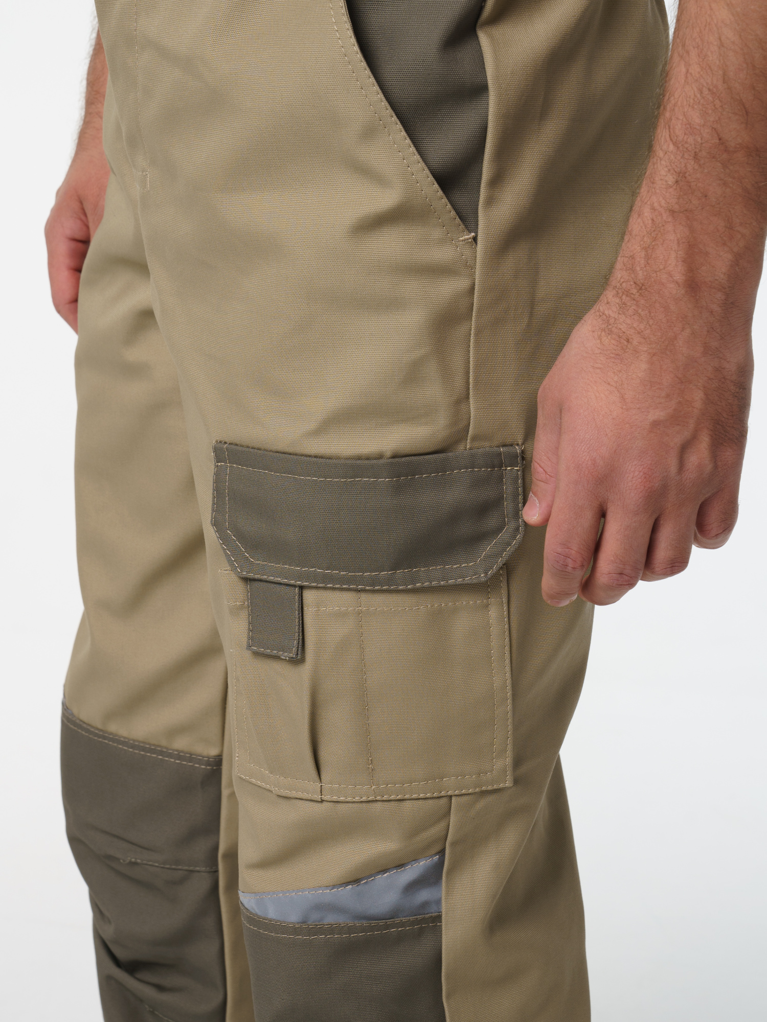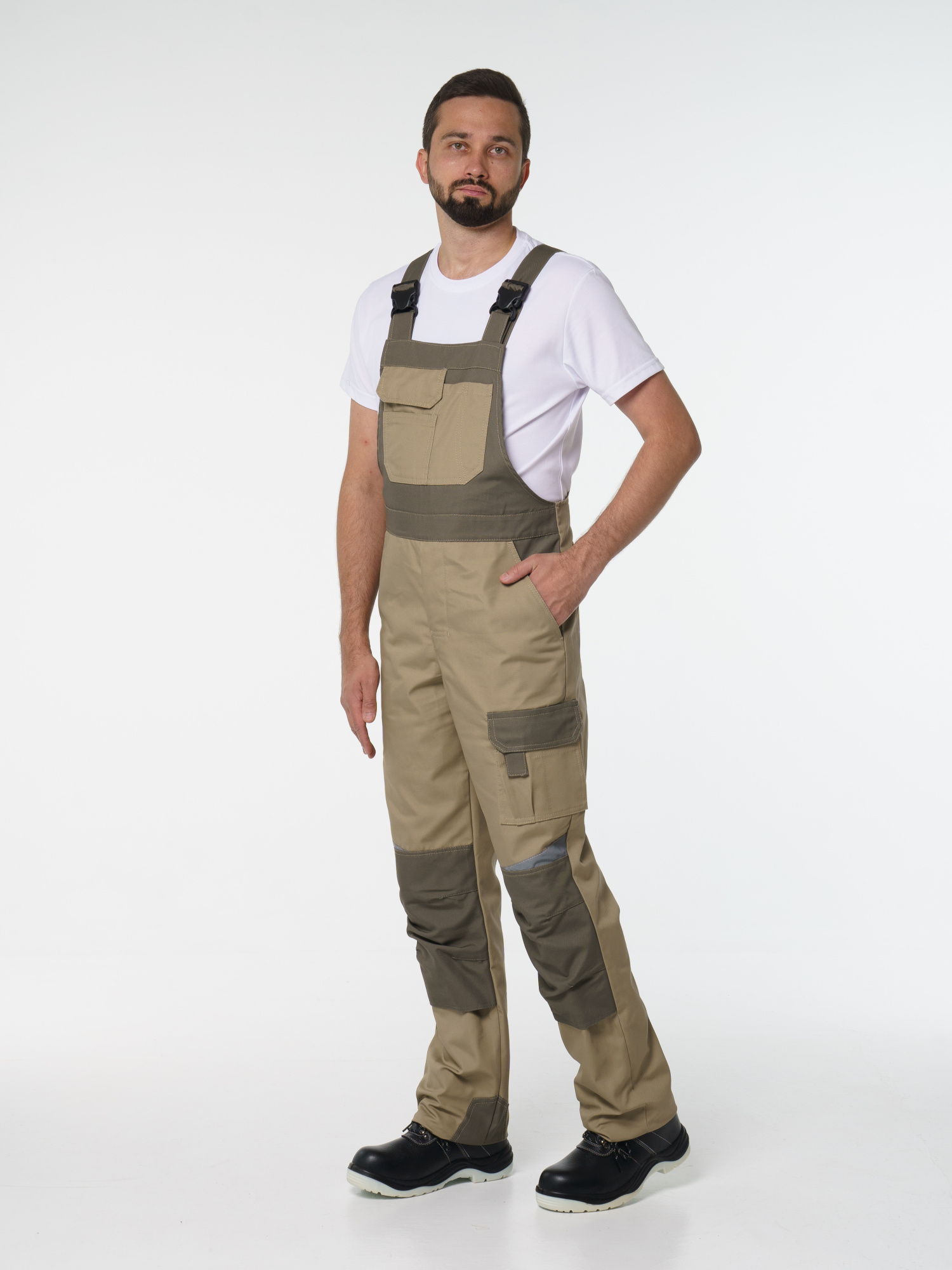 Полукомбинезон с застёжкой гульфика на молнию и застёжкой в боковом шве на пуговицы; с различными многофункциональными карманами; с объемными наколенниками. В полукомбинезоне предусмотрена лента светоотражающая (мелкодисперсная белая)  фигурной формы.