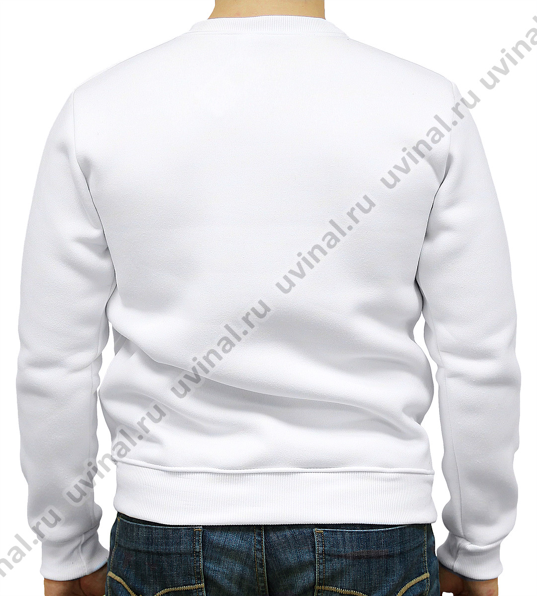 Плотная толстовка без капюшона белого цвета прямого покроя, состоит из турецкого трикотажного полотна футера из 3-х ниток с начесом плотностью 340 грамм/кв.метр. Манжеты рукавов, низ и горловина однотонного чисто белого свитшота изготовлены из эластичного трикотажного полотна "рибана".