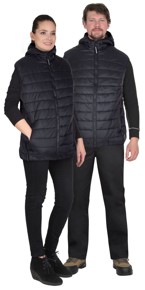 Жилет утепленный из стёганного полотна, с центральной бортовой застёжкой на молнию, с втачным капюшоном, с общей кокеткой полочек и спинки, с карманами на молнии в шве рельефа, с удлинённой фигурной линией низа на спинке. Низ куртки, пройма и лицевой вырез капюшона окантованы эластичной тесьмой.