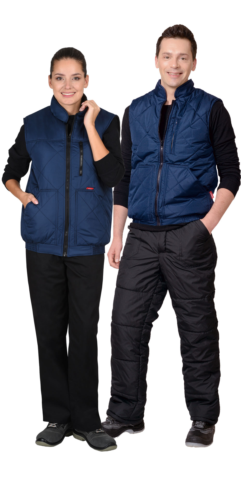 Жилет утеплённый, стёганный, на подкладке из флиса с центральной бортовой застёжкой на молнию, с воротником стойка, с нагрудным карманом с молнией и нижними фигурными утеплёнными карманами. Жилет на притачном поясе стянутом резинкой. ГОСТ 25295-2003