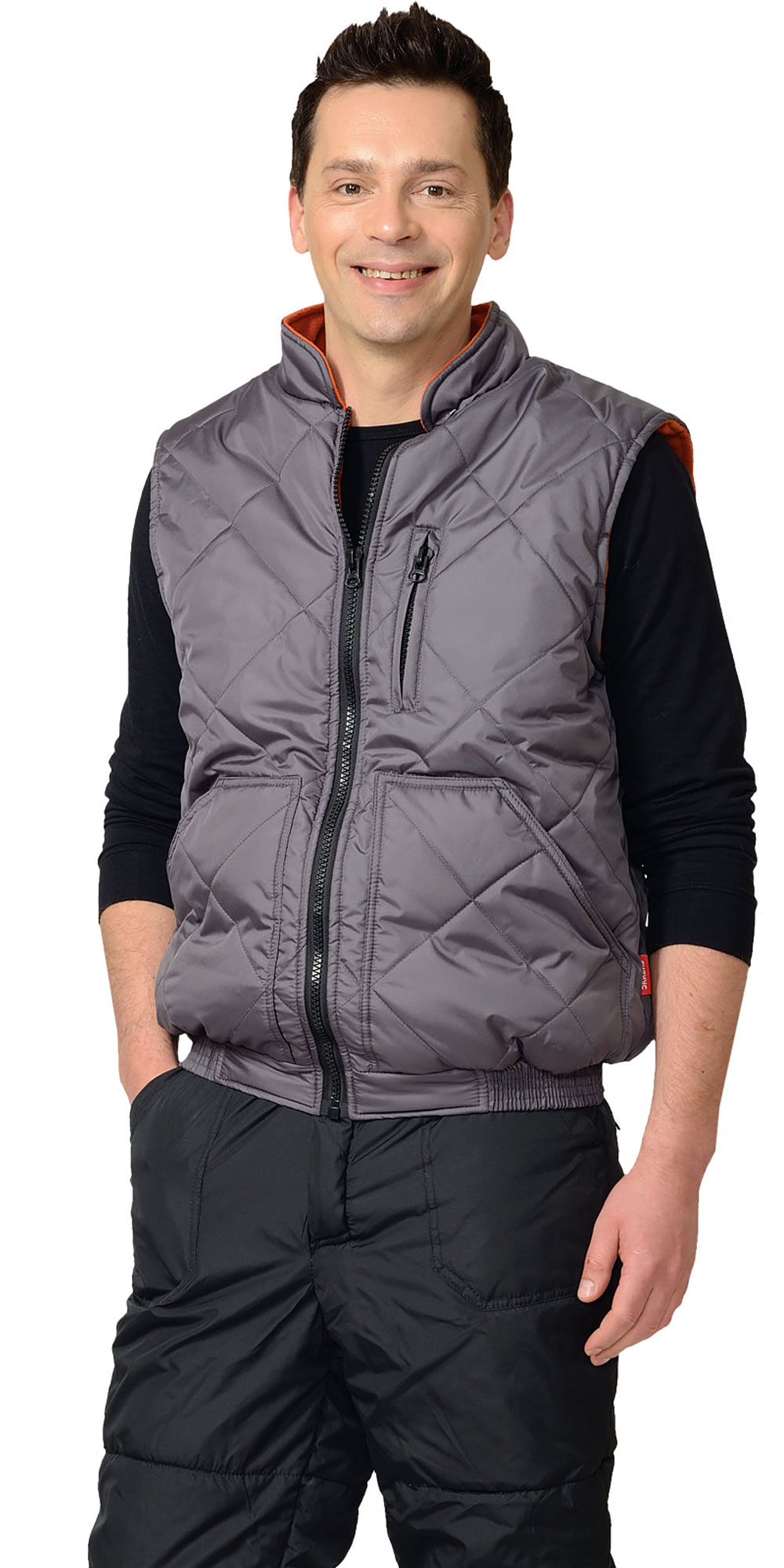 Жилет утеплённый, стёганный, на подкладке из флиса с центральной бортовой застёжкой на молнию, с воротником стойка, с нагрудным карманом с молнией и нижними фигурными утеплёнными карманами.