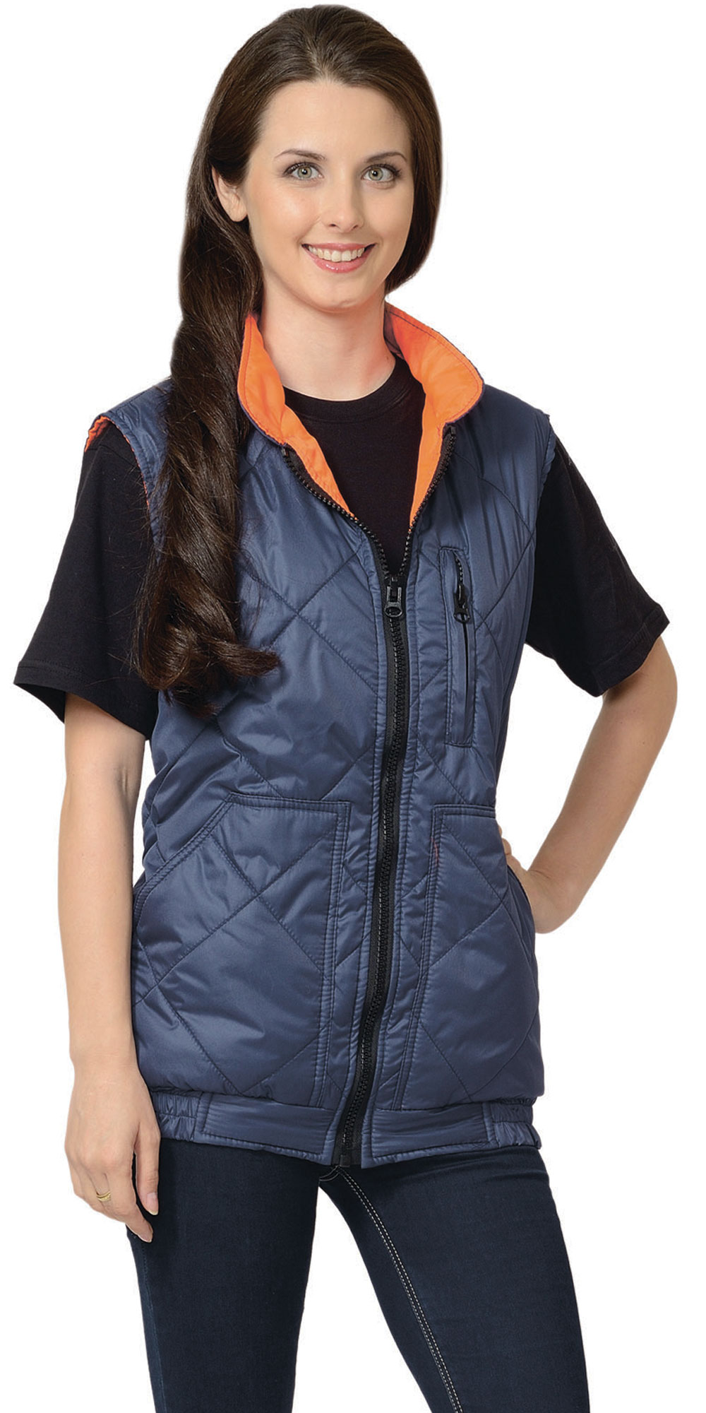 Жилет утеплённый, стёганный,с центральной бортовой застёжкой на молнию, с воротником стойка, с нагрудным карманом с молнией и нижними фигурными утеплёнными карманами. Жилет на притачном поясе стянутом резинкой. ГОСТ 25295-2003