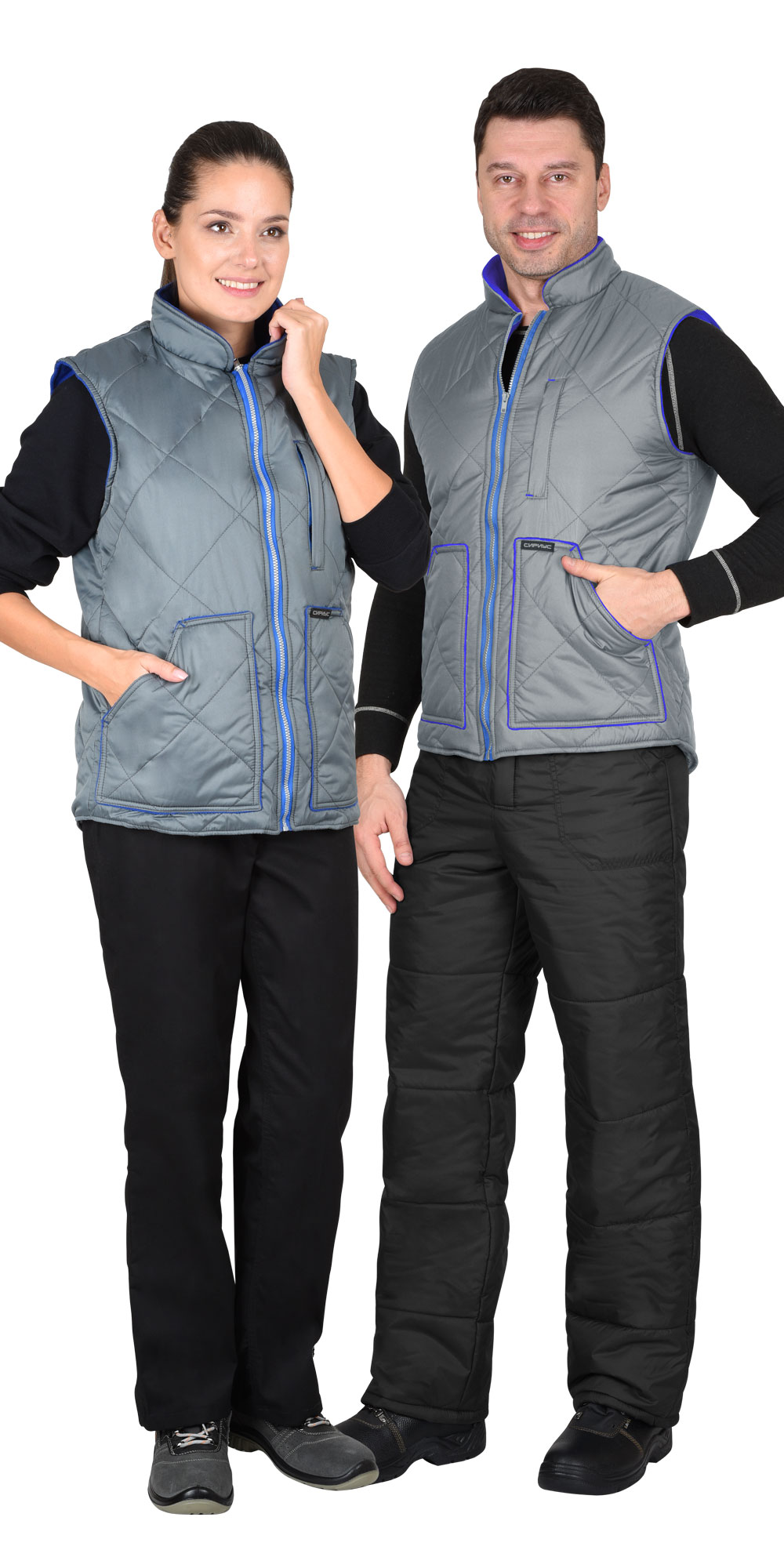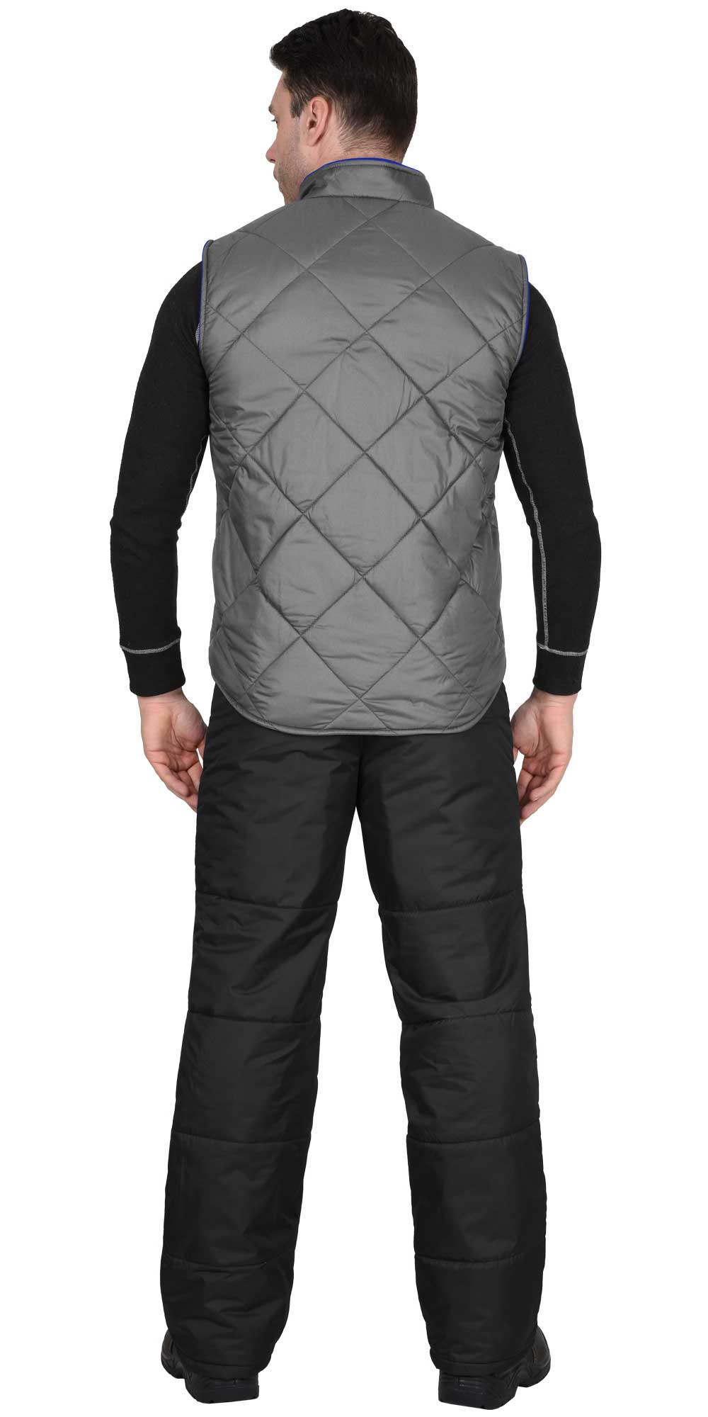 Жилет утеплённый, стёганный, прямого силуэта, на подкладке из флиса с центральной бортовой застёжкой на молнию, с воротником стойка, с нагрудным карманом с молнией и нижними фигурными утеплёнными карманами. Жилет с удлинённой спинкой. ГОСТ 25295-2003