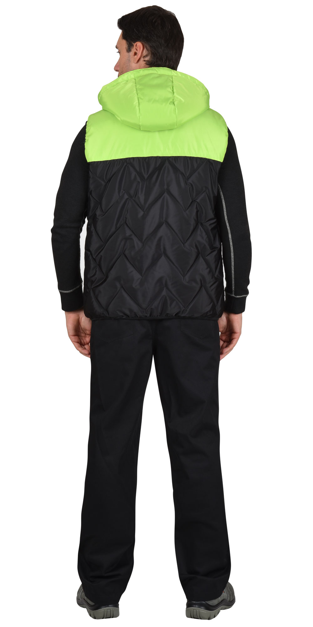 Жилет утеплённый, стёганный с утеплителем, на подкладке, прямого силуэта, с воротником стойка, с центральной бортовой застёжкой на тесьму - «молния», с прорезными карманами на тесьму - «молния», с внутренним карманом застегивающийся на тесьму - «молния», со съёмным капюшоном. Ткань верха №1 со стёжкой (синтепон 200г/м2): «Принц» с ВО: 100% п/э; пл.110 г/м2; Ткань отделочная: «Принц» с ВО: 100% п/э; пл.110 г/м2 . ГОСТ 25295-2003
