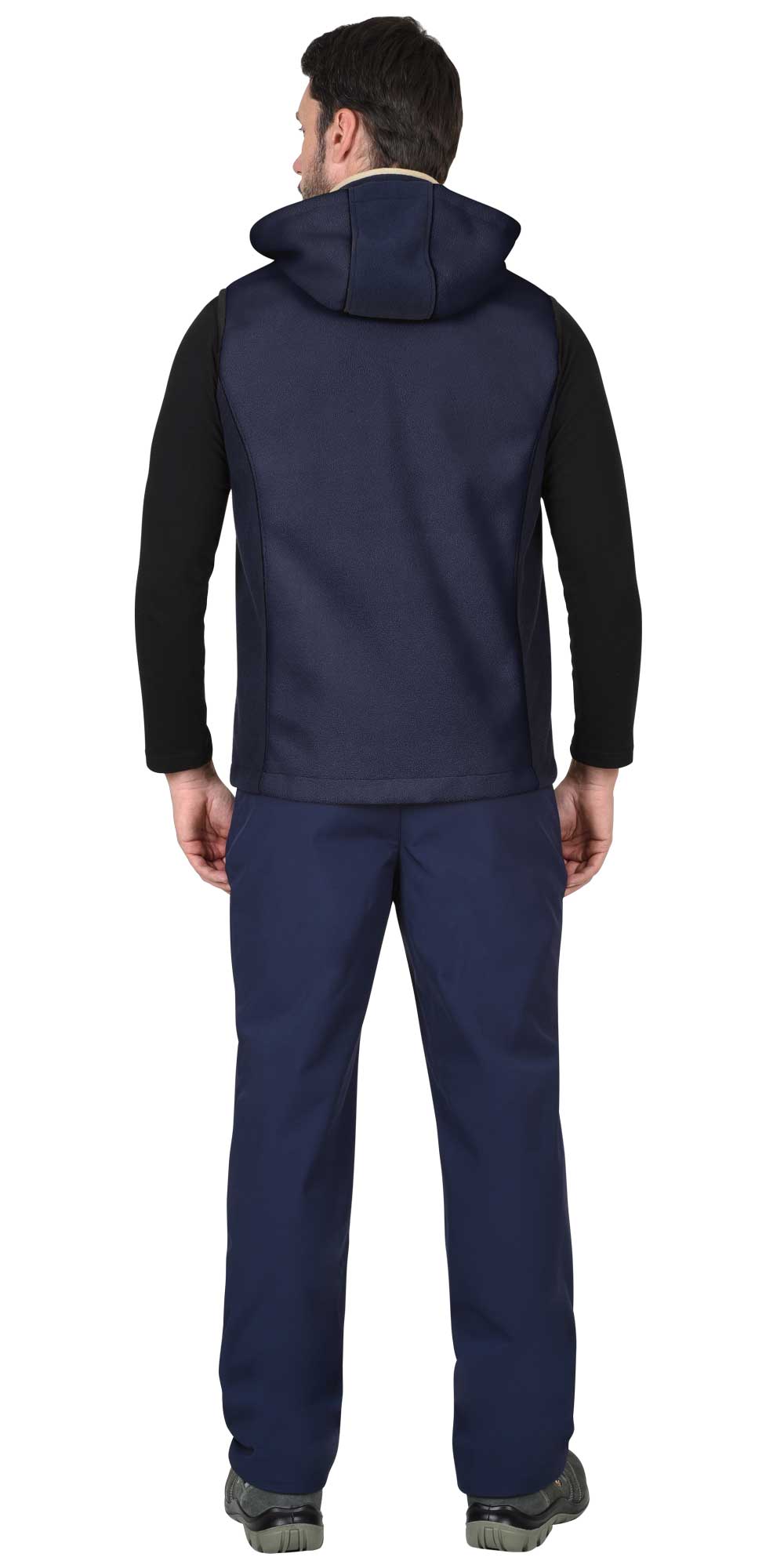 Жилет из дублированного флиса, без подкладки, прямого силуэта, с втачным воротником стойка, со съёмным капюшоном, со сквозной центральной, бортовой застёжкой на молнию, с отрезными бочками, с нижними боковыми карманами в рельефе. Пройма окантована резинкой ш.25 мм. ТР ТС 017/2011