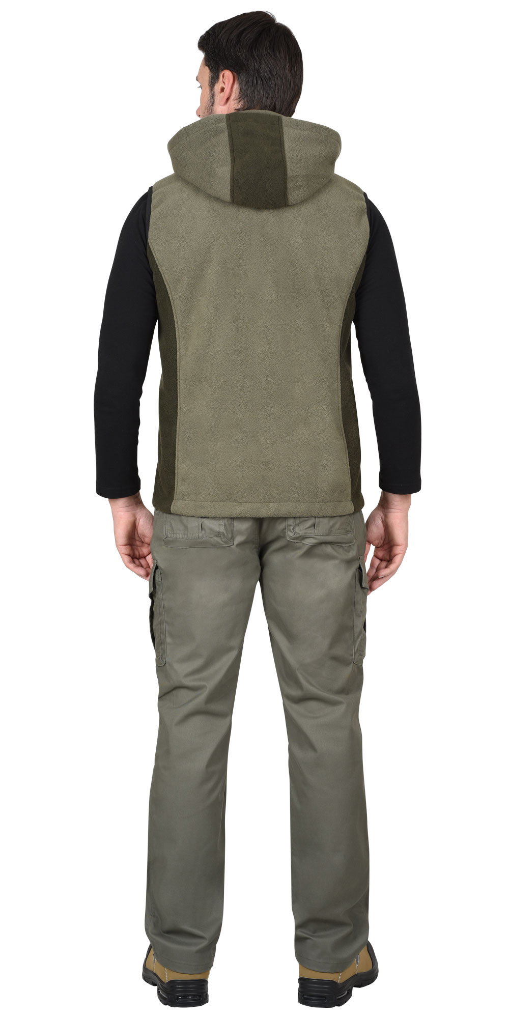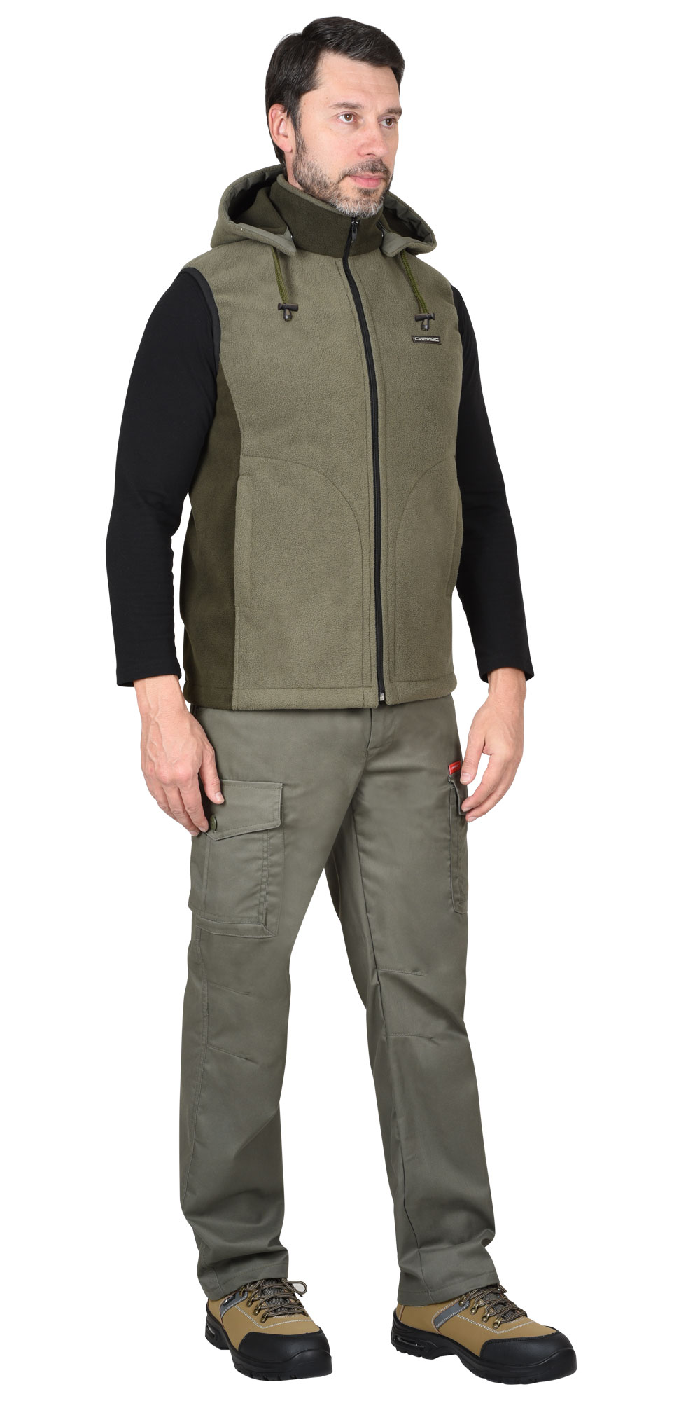 Жилеты из двустороннего флиса (со сторонами контрастного цвета), без подкладки, прямого силуэта, с втачным вортником стойка, со съёмным капюшоном, со сквозной центральной, бортовой застёжкой на тесьму молния от края вортоника до низа изделия, с отрезными бочками, с нижними боковыми карманами в рельефе. Пройма окантована резинкой ш.25 мм. ТР ТС 017/2011